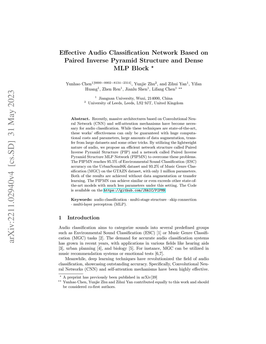 Recently, massive architectures based on Convolutional Neural Network (CNN) and self-attention mechanisms have become necessary for audio classification. While these techniques are state-of-the-art, these works' effectiveness can only be guaranteed with huge computational costs and parameters, large amounts of data augmentation, transfer from large datasets and some other tricks. By utilizing the lightweight nature of audio, we propose an efficient network structure called Paired Inverse Pyramid Structure (PIP) and a network called Paired Inverse Pyramid Structure MLP Network (PIPMN). The PIPMN reaches 96\% of Environmental Sound Classification (ESC) accuracy on the UrbanSound8K dataset and 93.2\% of Music Genre Classification (MGC) on the GTAZN dataset, with only 1 million parameters. Both of the results are achieved without data augmentation or model transfer. Public code is available at: https://github.com/JNAIC/PIPMN