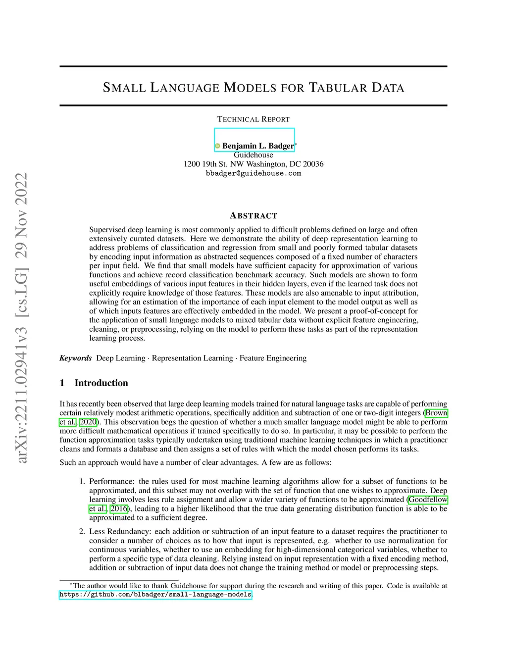 Supervised deep learning is most commonly applied to difficult problems defined on large and often extensively curated datasets. Here we demonstrate the ability of deep representation learning to address problems of classification and regression from small and poorly formed tabular datasets by encoding input information as abstracted sequences composed of a fixed number of characters per input field. We find that small models have sufficient capacity for approximation of various functions and achieve record classification benchmark accuracy. Such models are shown to form useful embeddings of various input features in their hidden layers, even if the learned task does not explicitly require knowledge of those features. These models are also amenable to input attribution, allowing for an estimation of the importance of each input element to the model output as well as of which inputs features are effectively embedded in the model. We present a proof-of-concept for the application of small language models to mixed tabular data without explicit feature engineering, cleaning, or preprocessing, relying on the model to perform these tasks as part of the representation learning process.