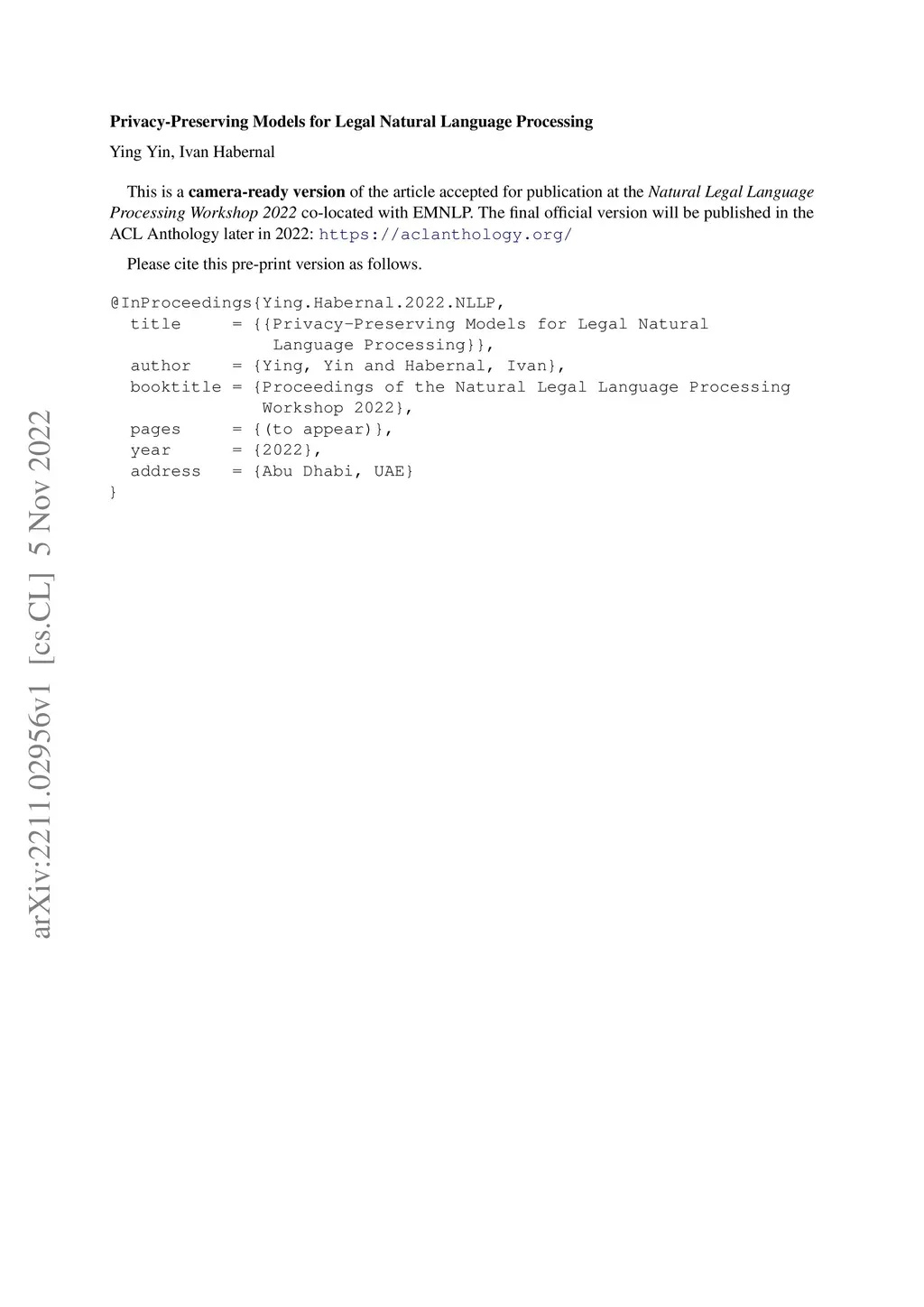 Privacy-Preserving Models for Legal Natural Language Processing