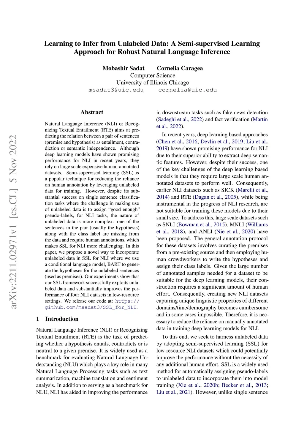 Natural Language Inference (NLI) or Recognizing Textual Entailment (RTE) aims at predicting the relation between a pair of sentences (premise and hypothesis) as entailment, contradiction or semantic independence. Although deep learning models have shown promising performance for NLI in recent years, they rely on large scale expensive human-annotated datasets. Semi-supervised learning (SSL) is a popular technique for reducing the reliance on human annotation by leveraging unlabeled data for training. However, despite its substantial success on single sentence classification tasks where the challenge in making use of unlabeled data is to assign "good enough" pseudo-labels, for NLI tasks, the nature of unlabeled data is more complex: one of the sentences in the pair (usually the hypothesis) along with the class label are missing from the data and require human annotations, which makes SSL for NLI more challenging. In this paper, we propose a novel way to incorporate unlabeled data in SSL for NLI where we use a conditional language model, BART to generate the hypotheses for the unlabeled sentences (used as premises). Our experiments show that our SSL framework successfully exploits unlabeled data and substantially improves the performance of four NLI datasets in low-resource settings. We release our code at: https://github.com/msadat3/SSL_for_NLI.