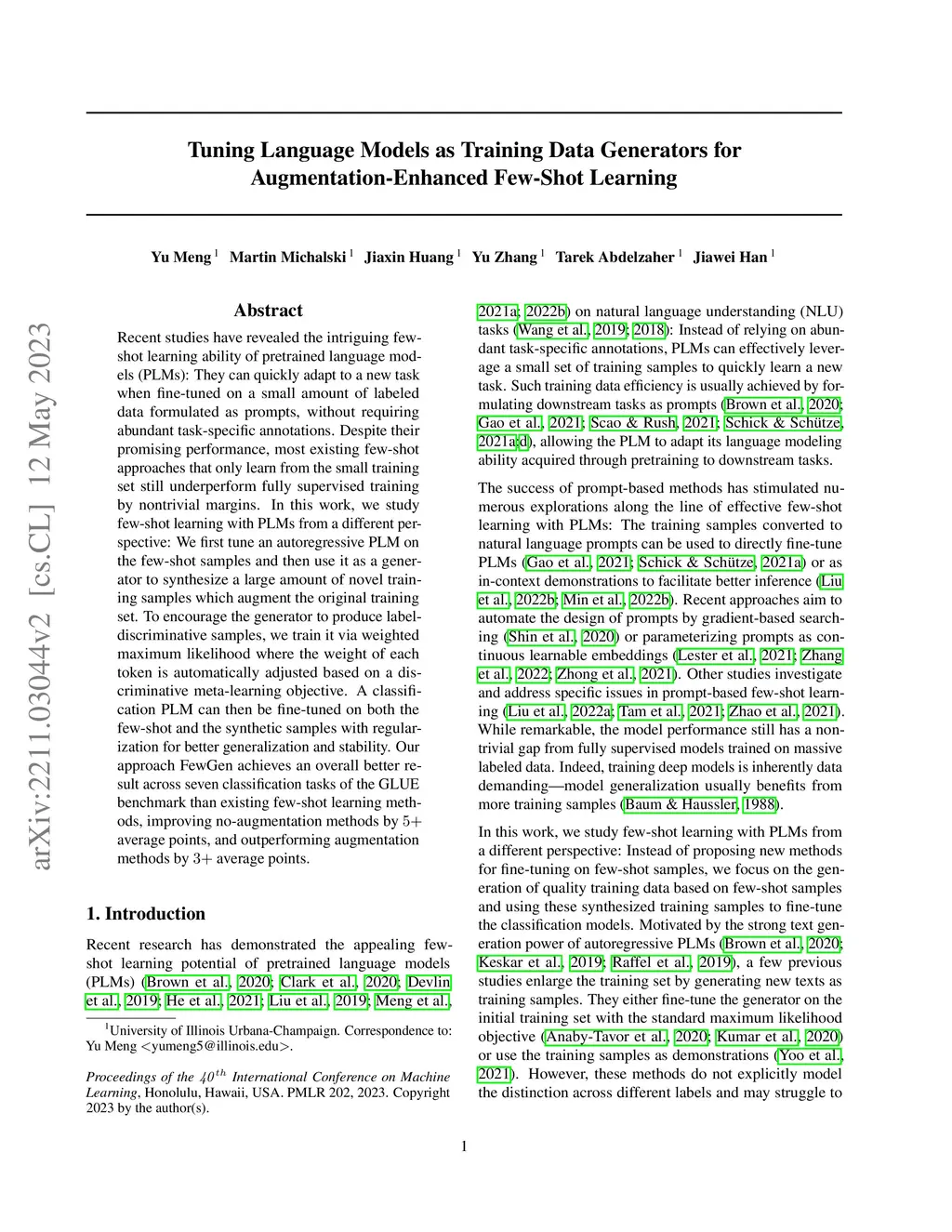 Recent studies have revealed the intriguing few-shot learning ability of pretrained language models (PLMs): They can quickly adapt to a new task when fine-tuned on a small amount of labeled data formulated as prompts, without requiring abundant task-specific annotations. Despite their promising performance, most existing few-shot approaches that only learn from the small training set still underperform fully supervised training by nontrivial margins. In this work, we study few-shot learning with PLMs from a different perspective: We first tune an autoregressive PLM on the few-shot samples and then use it as a generator to synthesize a large amount of novel training samples which augment the original training set. To encourage the generator to produce label-discriminative samples, we train it via weighted maximum likelihood where the weight of each token is automatically adjusted based on a discriminative meta-learning objective. A classification PLM can then be fine-tuned on both the few-shot and the synthetic samples with regularization for better generalization and stability. Our approach FewGen achieves an overall better result across seven classification tasks of the GLUE benchmark than existing few-shot learning methods, improving no-augmentation methods by 5+ average points, and outperforming augmentation methods by 3+ average points.