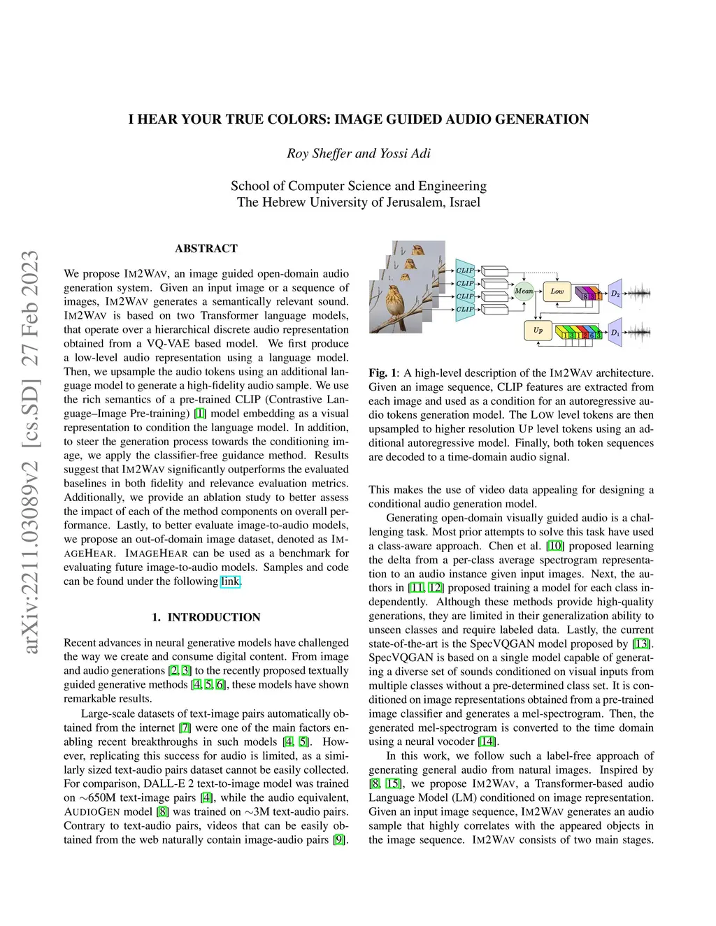 We propose Im2Wav, an image guided open-domain audio generation system. Given an input image or a sequence of images, Im2Wav generates a semantically relevant sound. Im2Wav is based on two Transformer language models, that operate over a hierarchical discrete audio representation obtained from a VQ-VAE based model. We first produce a low-level audio representation using a language model. Then, we upsample the audio tokens using an additional language model to generate a high-fidelity audio sample. We use the rich semantics of a pre-trained CLIP (Contrastive Language-Image Pre-training) embedding as a visual representation to condition the language model. In addition, to steer the generation process towards the conditioning image, we apply the classifier-free guidance method. Results suggest that Im2Wav significantly outperforms the evaluated baselines in both fidelity and relevance evaluation metrics. Additionally, we provide an ablation study to better assess the impact of each of the method components on overall performance. Lastly, to better evaluate image-to-audio models, we propose an out-of-domain image dataset, denoted as ImageHear. ImageHear can be used as a benchmark for evaluating future image-to-audio models. Samples and code can be found inside the manuscript.