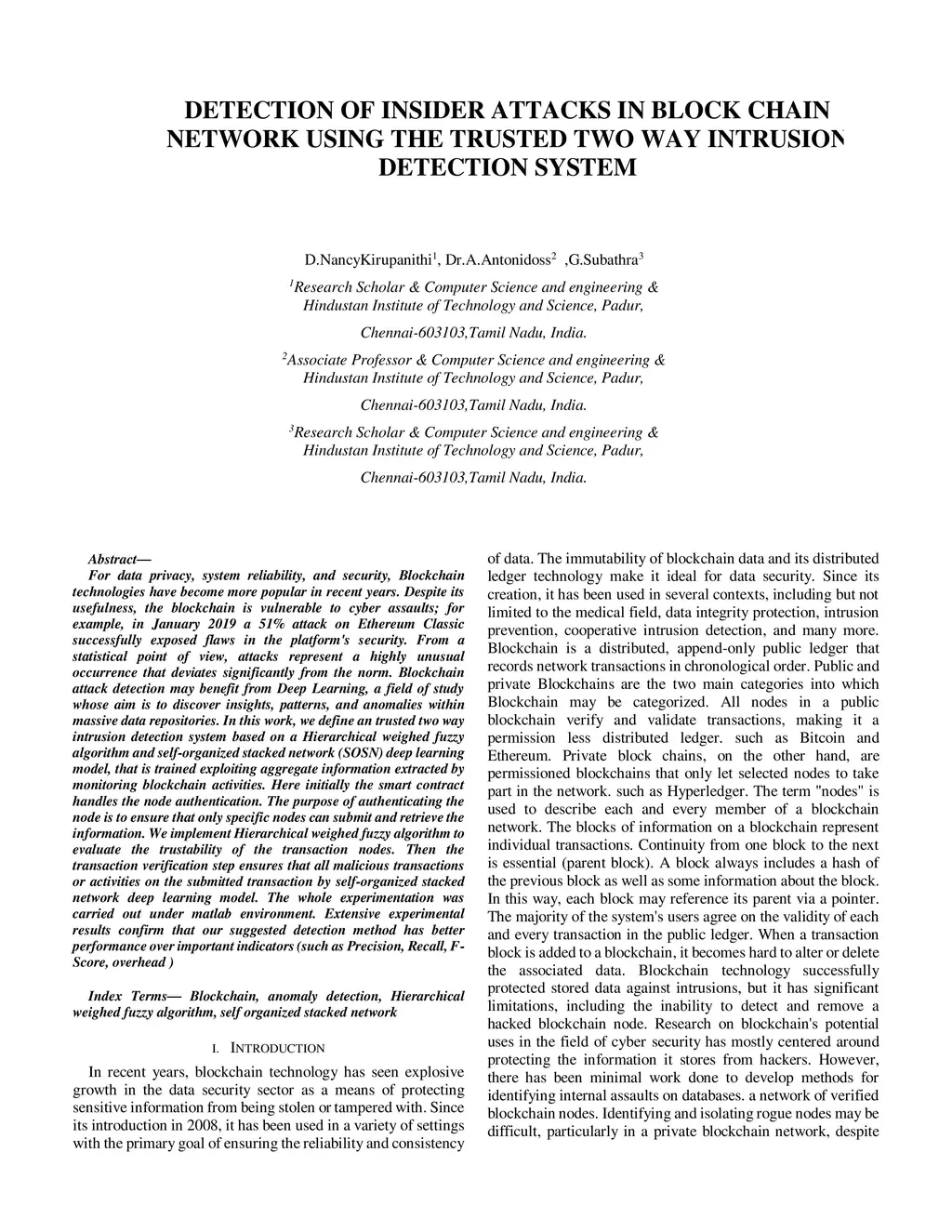 For data privacy, system reliability, and security, Blockchain technologies have become more popular in recent years. Despite its usefulness, the blockchain is vulnerable to cyber assaults; for example, in January 2019 a 51% attack on Ethereum Classic successfully exposed flaws in the platform's security. From a statistical point of view, attacks represent a highly unusual occurrence that deviates significantly from the norm. Blockchain attack detection may benefit from Deep Learning, a field of study whose aim is to discover insights, patterns, and anomalies within massive data repositories. In this work, we define an trusted two way intrusion detection system based on a Hierarchical weighed fuzzy algorithm and self-organized stacked network (SOSN) deep learning model, that is trained exploiting aggregate information extracted by monitoring blockchain activities. Here initially the smart contract handles the node authentication. The purpose of authenticating the node is to ensure that only specific nodes can submit and retrieve the information. We implement Hierarchical weighed fuzzy algorithm to evaluate the trust ability of the transaction nodes. Then the transaction verification step ensures that all malicious transactions or activities on the submitted transaction by self-organized stacked network deep learning model. The whole experimentation was carried out under matlab environment. Extensive experimental results confirm that our suggested detection method has better performance over important indicators such as Precision, Recall, F-Score, overhead.