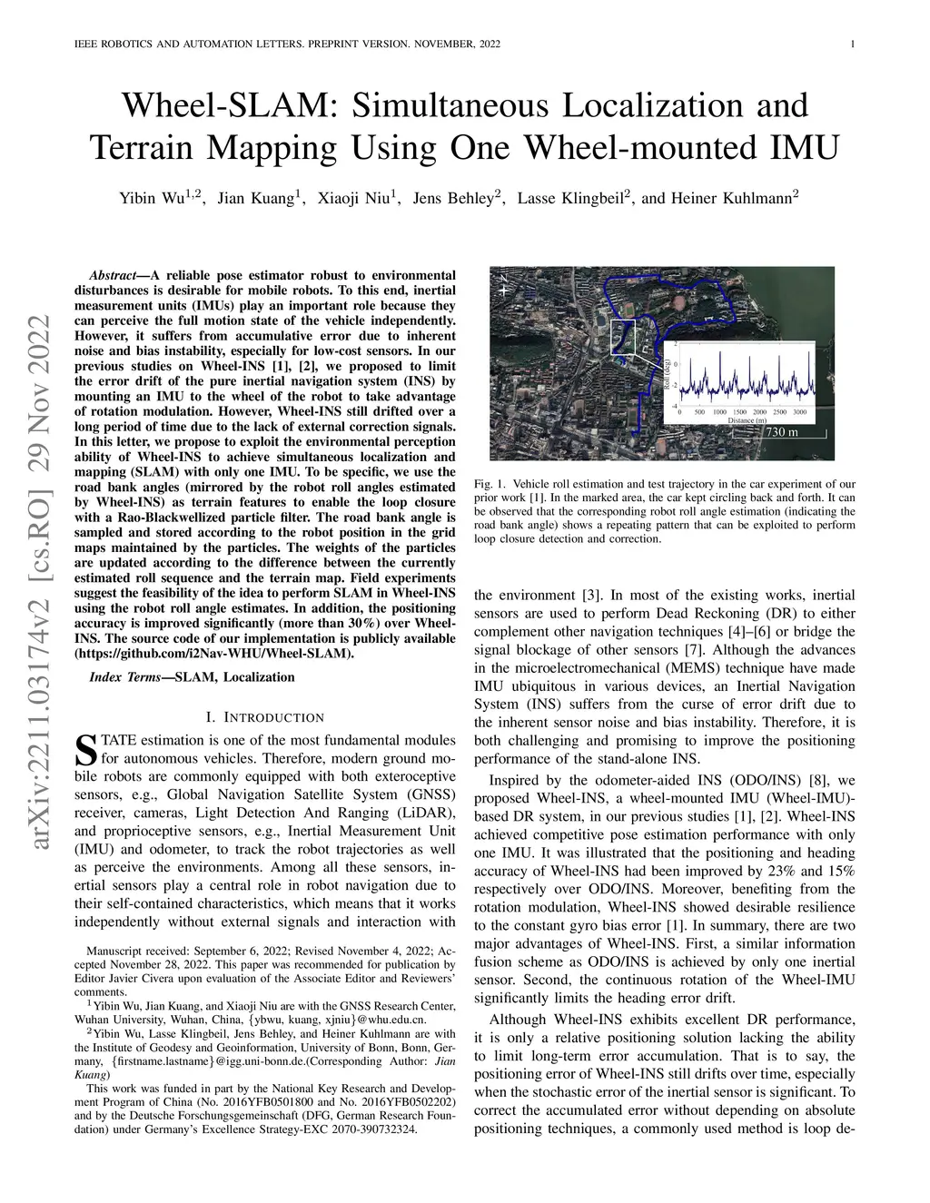A reliable pose estimator robust to environmental disturbances is desirable for mobile robots. To this end, inertial measurement units (IMUs) play an important role because they can perceive the full motion state of the vehicle independently. However, it suffers from accumulative error due to inherent noise and bias instability, especially for low-cost sensors. In our previous studies on Wheel-INS \cite{niu2021, wu2021}, we proposed to limit the error drift of the pure inertial navigation system (INS) by mounting an IMU to the wheel of the robot to take advantage of rotation modulation. However, it still drifted over a long period of time due to the lack of external correction signals. In this letter, we propose to exploit the environmental perception ability of Wheel-INS to achieve simultaneous localization and mapping (SLAM) with only one IMU. To be specific, we use the road bank angles (mirrored by the robot roll angles estimated by Wheel-INS) as terrain features to enable the loop closure with a Rao-Blackwellized particle filter. The road bank angle is sampled and stored according to the robot position in the grid maps maintained by the particles. The weights of the particles are updated according to the difference between the currently estimated roll sequence and the terrain map. Field experiments suggest the feasibility of the idea to perform SLAM in Wheel-INS using the robot roll angle estimates. In addition, the positioning accuracy is improved significantly (more than 30\%) over Wheel-INS. Source code of our implementation is publicly available (https://github.com/i2Nav-WHU/Wheel-SLAM).