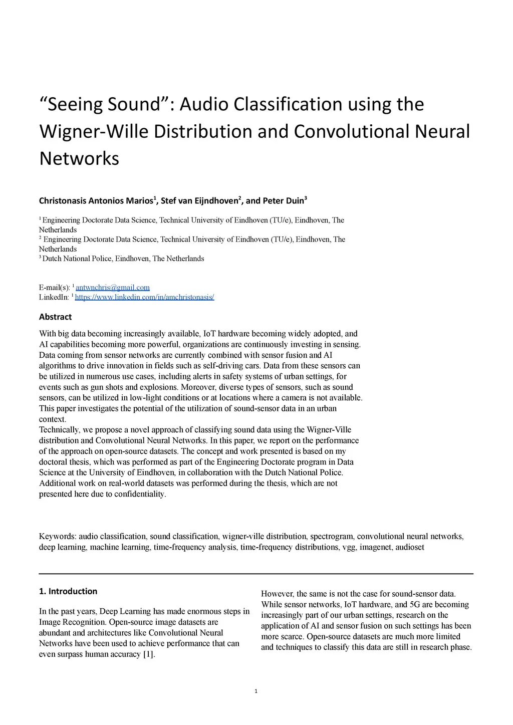 With big data becoming increasingly available, IoT hardware becoming widely adopted, and AI capabilities becoming more powerful, organizations are continuously investing in sensing. Data coming from sensor networks are currently combined with sensor fusion and AI algorithms to drive innovation in fields such as self-driving cars. Data from these sensors can be utilized in numerous use cases, including alerts in safety systems of urban settings, for events such as gun shots and explosions. Moreover, diverse types of sensors, such as sound sensors, can be utilized in low-light conditions or at locations where a camera is not available. This paper investigates the potential of the utilization of sound-sensor data in an urban context. Technically, we propose a novel approach of classifying sound data using the Wigner-Ville distribution and Convolutional Neural Networks. In this paper, we report on the performance of the approach on open-source datasets. The concept and work presented is based on my doctoral thesis, which was performed as part of the Engineering Doctorate program in Data Science at the University of Eindhoven, in collaboration with the Dutch National Police. Additional work on real-world datasets was performed during the thesis, which are not presented here due to confidentiality.