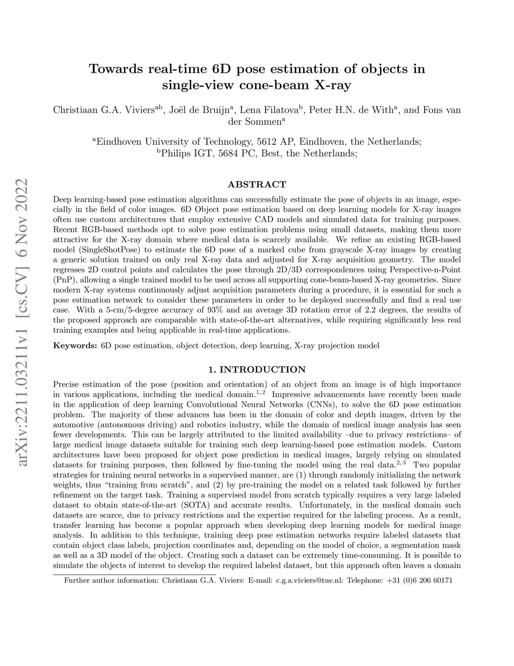 Towards real-time 6D pose estimation of objects in single-view cone-beam