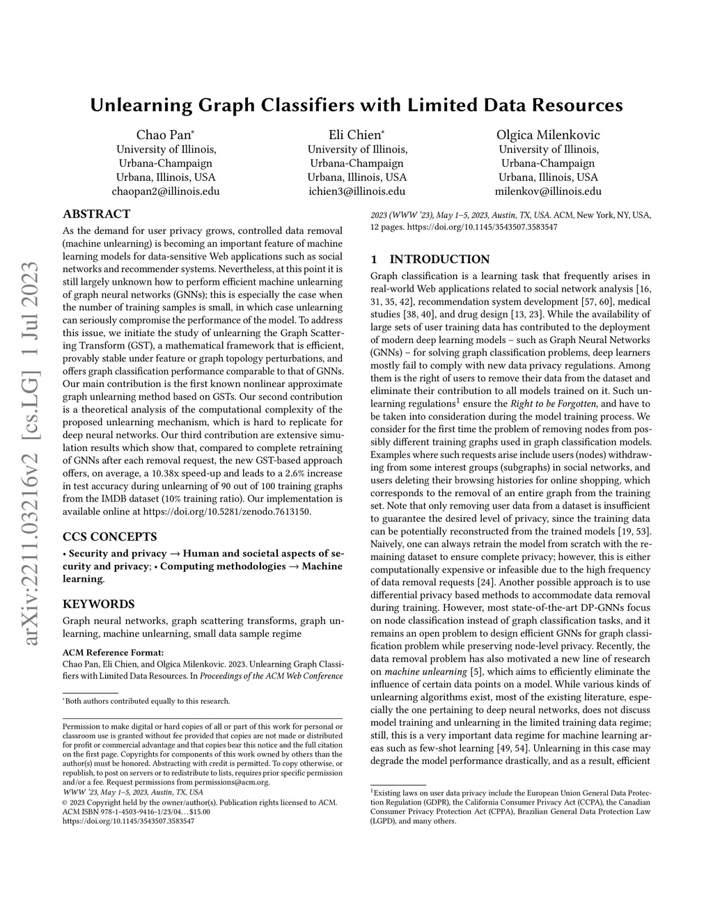 As the demand for user privacy grows, controlled data removal (machine unlearning) is becoming an important feature of machine learning models for data-sensitive Web applications such as social networks and recommender systems. Nevertheless, at this point it is still largely unknown how to perform efficient machine unlearning of graph neural networks (GNNs); this is especially the case when the number of training samples is small, in which case unlearning can seriously compromise the performance of the model. To address this issue, we initiate the study of unlearning the Graph Scattering Transform (GST), a mathematical framework that is efficient, provably stable under feature or graph topology perturbations, and offers graph classification performance comparable to that of GNNs. Our main contribution is the first known nonlinear approximate graph unlearning method based on GSTs. Our second contribution is a theoretical analysis of the computational complexity of the proposed unlearning mechanism, which is hard to replicate for deep neural networks. Our third contribution are extensive simulation results which show that, compared to complete retraining of GNNs after each removal request, the new GST-based approach offers, on average, a 10.38x speed-up and leads to a 2.6% increase in test accuracy during unlearning of 90 out of 100 training graphs from the IMDB dataset (10% training ratio). Our implementation is available online at https://doi.org/10.5281/zenodo.7613150.