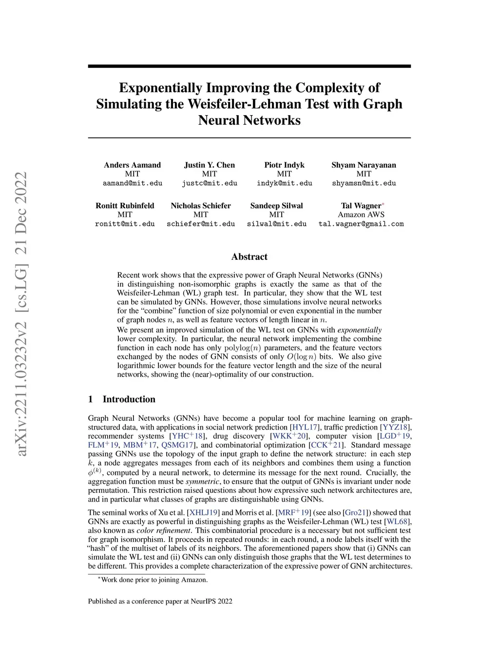 Recent work shows that the expressive power of Graph Neural Networks (GNNs) in distinguishing non-isomorphic graphs is exactly the same as that of the Weisfeiler-Lehman (WL) graph test. In particular, they show that the WL test can be simulated by GNNs. However, those simulations involve neural networks for the 'combine' function of size polynomial or even exponential in the number of graph nodes , as well as feature vectors of length linear in . We present an improved simulation of the WL test on GNNs with \emph{exponentially} lower complexity. In particular, the neural network implementing the combine function in each node has only a polylogarithmic number of parameters in , and the feature vectors exchanged by the nodes of GNN consists of only bits. We also give logarithmic lower bounds for the feature vector length and the size of the neural networks, showing the (near)-optimality of our construction.