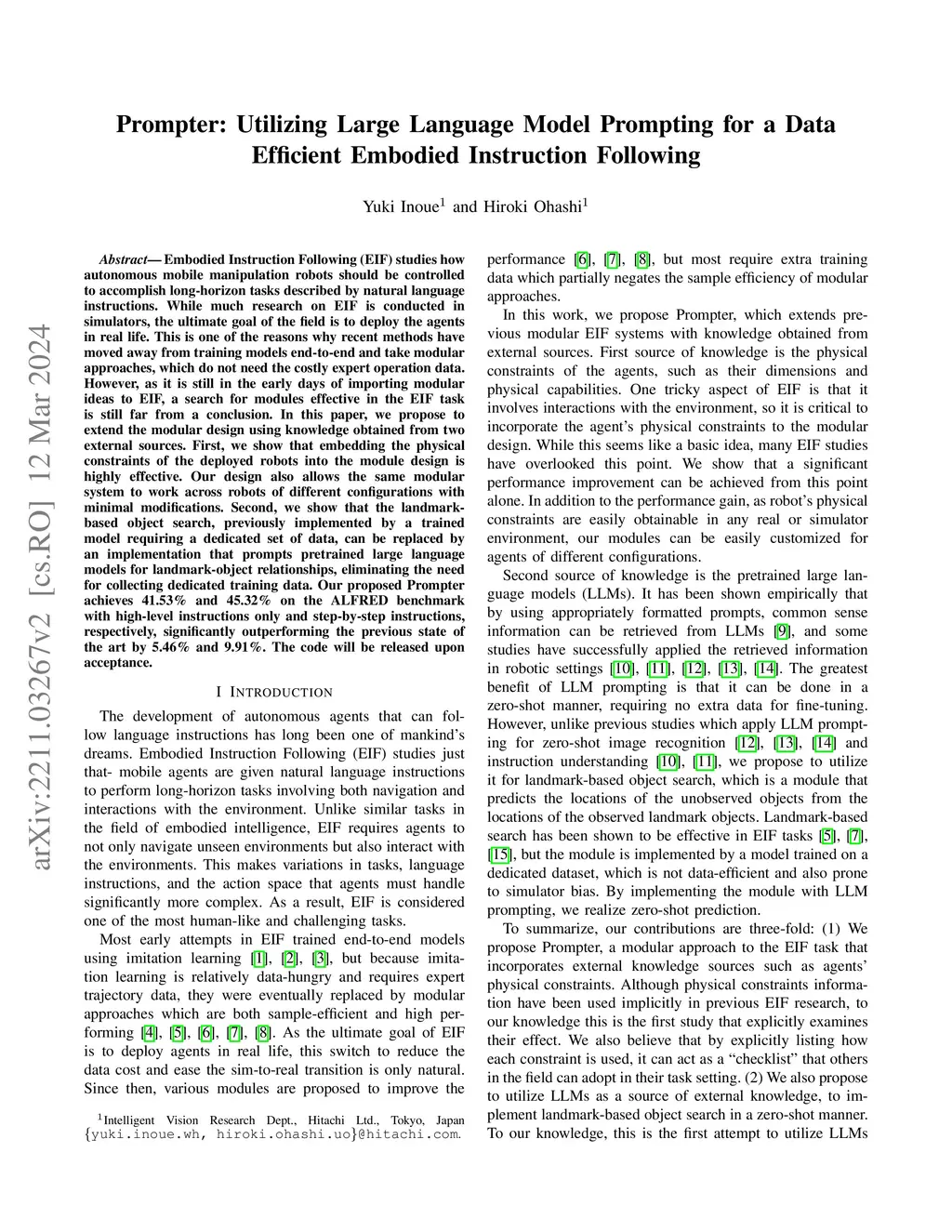 Embodied Instruction Following (EIF) studies how autonomous mobile manipulation robots should be controlled to accomplish long-horizon tasks described by natural language instructions. While much research on EIF is conducted in simulators, the ultimate goal of the field is to deploy the agents in real life. This is one of the reasons why recent methods have moved away from training models end-to-end and take modular approaches, which do not need the costly expert operation data. However, as it is still in the early days of importing modular ideas to EIF, a search for modules effective in the EIF task is still far from a conclusion. In this paper, we propose to extend the modular design using knowledge obtained from two external sources. First, we show that embedding the physical constraints of the deployed robots into the module design is highly effective. Our design also allows the same modular system to work across robots of different configurations with minimal modifications. Second, we show that the landmark-based object search, previously implemented by a trained model requiring a dedicated set of data, can be replaced by an implementation that prompts pretrained large language models for landmark-object relationships, eliminating the need for collecting dedicated training data. Our proposed Prompter achieves 41.53\% and 45.32\% on the ALFRED benchmark with high-level instructions only and step-by-step instructions, respectively, significantly outperforming the previous state of the art by 5.46\% and 9.91\%.