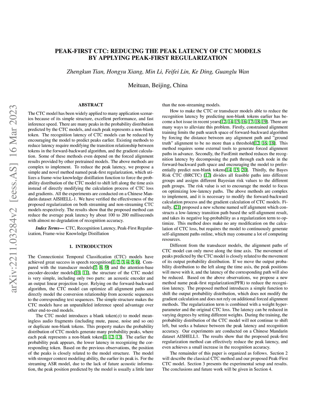 The CTC model has been widely applied to many application scenarios because of its simple structure, excellent performance, and fast inference speed. There are many peaks in the probability distribution predicted by the CTC models, and each peak represents a non-blank token. The recognition latency of CTC models can be reduced by encouraging the model to predict peaks earlier. Existing methods to reduce latency require modifying the transition relationship between tokens in the forward-backward algorithm, and the gradient calculation. Some of these methods even depend on the forced alignment results provided by other pretrained models. The above methods are complex to implement. To reduce the peak latency, we propose a simple and novel method named peak-first regularization, which utilizes a frame-wise knowledge distillation function to force the probability distribution of the CTC model to shift left along the time axis instead of directly modifying the calculation process of CTC loss and gradients. All the experiments are conducted on a Chinese Mandarin dataset AISHELL-1. We have verified the effectiveness of the proposed regularization on both streaming and non-streaming CTC models respectively. The results show that the proposed method can reduce the average peak latency by about 100 to 200 milliseconds with almost no degradation of recognition accuracy.