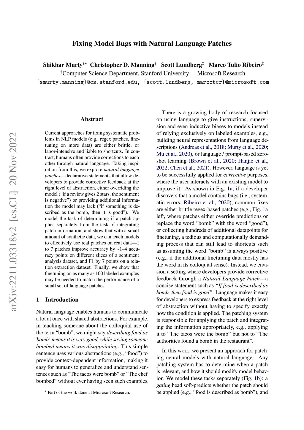 Current approaches for fixing systematic problems in NLP models (e.g. regex patches, finetuning on more data) are either brittle, or labor-intensive and liable to shortcuts. In contrast, humans often provide corrections to each other through natural language. Taking inspiration from this, we explore natural language patches -- declarative statements that allow developers to provide corrective feedback at the right level of abstraction, either overriding the model (``if a review gives 2 stars, the sentiment is negative'') or providing additional information the model may lack (``if something is described as the bomb, then it is good''). We model the task of determining if a patch applies separately from the task of integrating patch information, and show that with a small amount of synthetic data, we can teach models to effectively use real patches on real data -- 1 to 7 patches improve accuracy by ~1-4 accuracy points on different slices of a sentiment analysis dataset, and F1 by 7 points on a relation extraction dataset. Finally, we show that finetuning on as many as 100 labeled examples may be needed to match the performance of a small set of language patches.