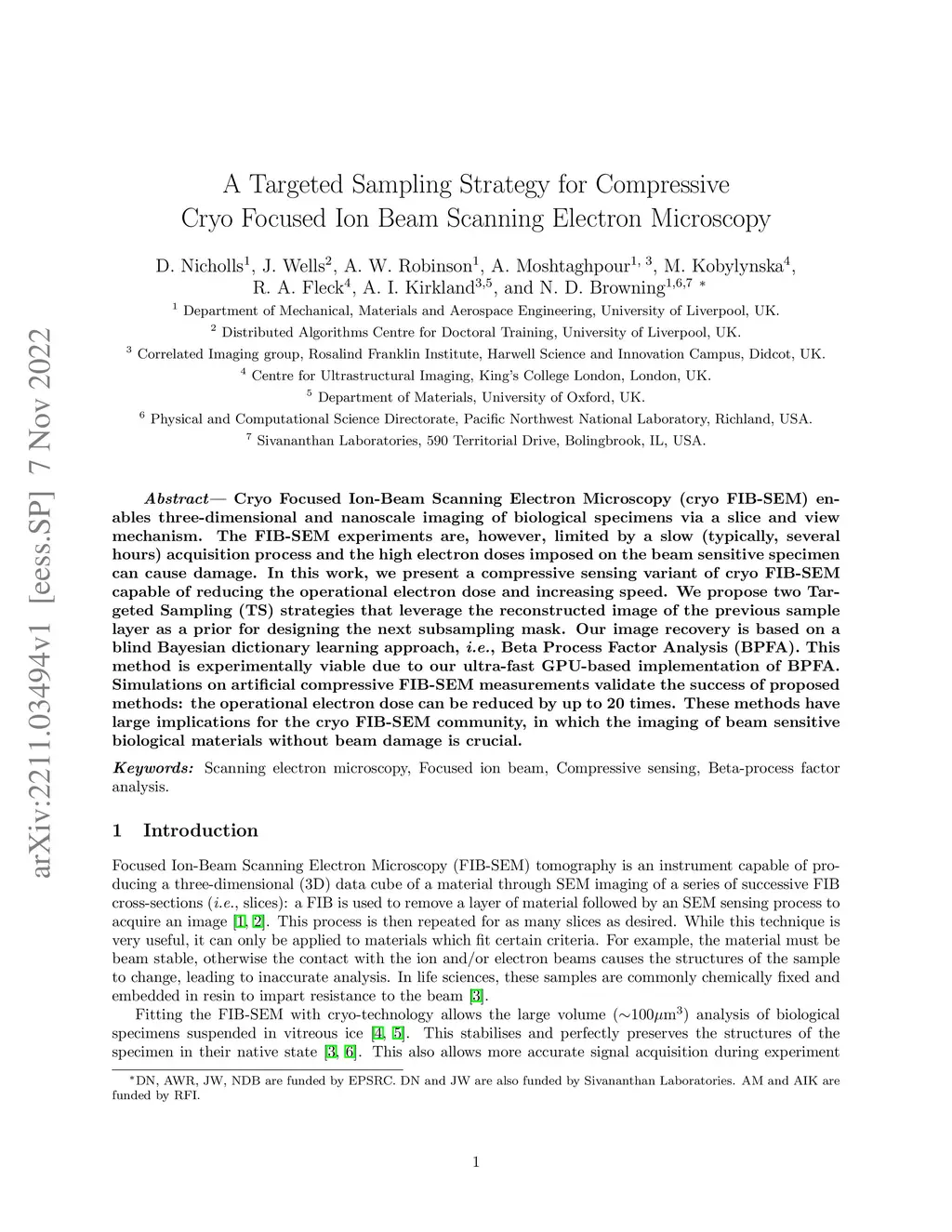 Cryo Focused Ion-Beam Scanning Electron Microscopy (cryo FIB-SEM) enables three-dimensional and nanoscale imaging of biological specimens via a slice and view mechanism. The FIB-SEM experiments are, however, limited by a slow (typically, several hours) acquisition process and the high electron doses imposed on the beam sensitive specimen can cause damage. In this work, we present a compressive sensing variant of cryo FIB-SEM capable of reducing the operational electron dose and increasing speed. We propose two Targeted Sampling (TS) strategies that leverage the reconstructed image of the previous sample layer as a prior for designing the next subsampling mask. Our image recovery is based on a blind Bayesian dictionary learning approach, i.e., Beta Process Factor Analysis (BPFA). This method is experimentally viable due to our ultra-fast GPU-based implementation of BPFA. Simulations on artificial compressive FIB-SEM measurements validate the success of proposed methods: the operational electron dose can be reduced by up to 20 times. These methods have large implications for the cryo FIB-SEM community, in which the imaging of beam sensitive biological materials without beam damage is crucial.