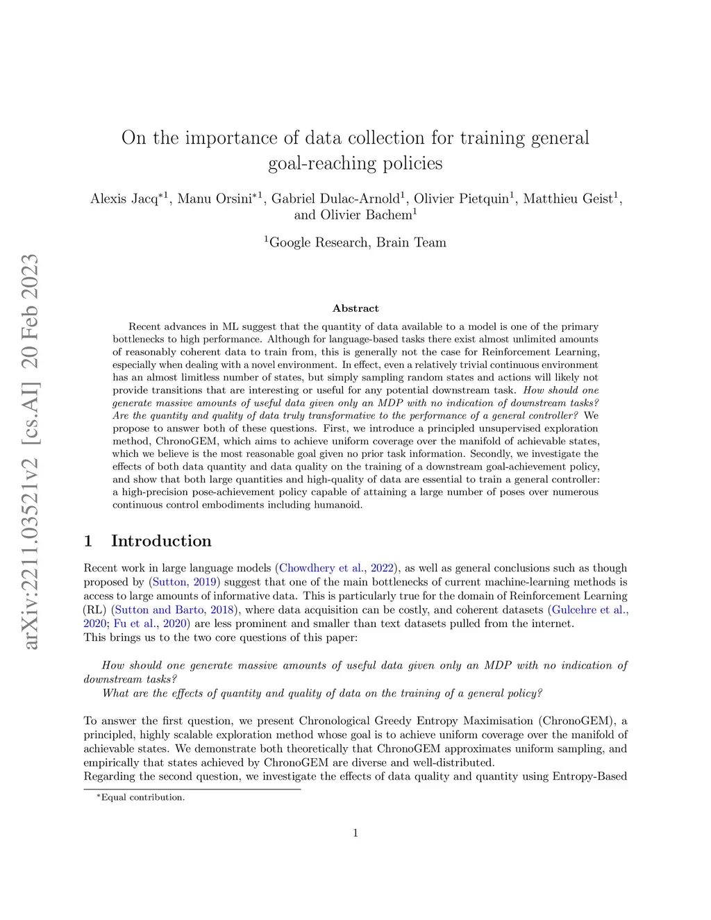 Recent advances in ML suggest that the quantity of data available to a model is one of the primary bottlenecks to high performance. Although for language-based tasks there exist almost unlimited amounts of reasonably coherent data to train from, this is generally not the case for Reinforcement Learning, especially when dealing with a novel environment. In effect, even a relatively trivial continuous environment has an almost limitless number of states, but simply sampling random states and actions will likely not provide transitions that are interesting or useful for any potential downstream task. How should one generate massive amounts of useful data given only an MDP with no indication of downstream tasks? Are the quantity and quality of data truly transformative to the performance of a general controller? We propose to answer both of these questions. First, we introduce a principled unsupervised exploration method, ChronoGEM, which aims to achieve uniform coverage over the manifold of achievable states, which we believe is the most reasonable goal given no prior task information. Secondly, we investigate the effects of both data quantity and data quality on the training of a downstream goal-achievement policy, and show that both large quantities and high-quality of data are essential to train a general controller: a high-precision pose-achievement policy capable of attaining a large number of poses over numerous continuous control embodiments including humanoid.