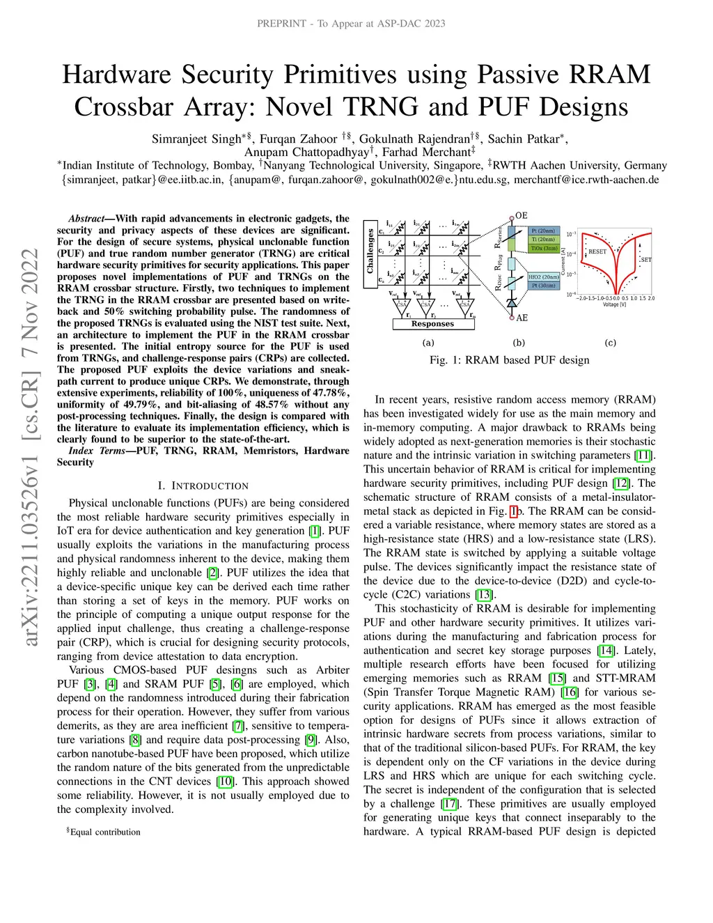 Hardware Security Primitives using Passive RRAM Crossbar Array: Novel