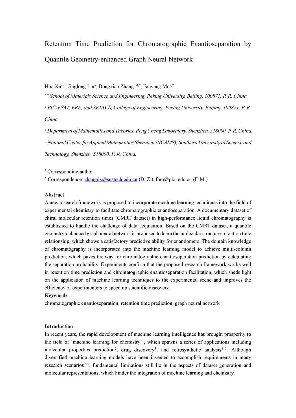 A new research framework is proposed to incorporate machine learning techniques into the field of experimental chemistry to facilitate chromatographic enantioseparation. A documentary dataset of chiral molecular retention times (CMRT dataset) in high-performance liquid chromatography is established to handle the challenge of data acquisition. Based on the CMRT dataset, a quantile geometry-enhanced graph neural network is proposed to learn the molecular structure-retention time relationship, which shows a satisfactory predictive ability for enantiomers. The domain knowledge of chromatography is incorporated into the machine learning model to achieve multi-column prediction, which paves the way for chromatographic enantioseparation prediction by calculating the separation probability. Experiments confirm that the proposed research framework works well in retention time prediction and chromatographic enantioseparation facilitation, which sheds light on the application of machine learning techniques to the experimental scene and improves the efficiency of experimenters to speed up scientific discovery.