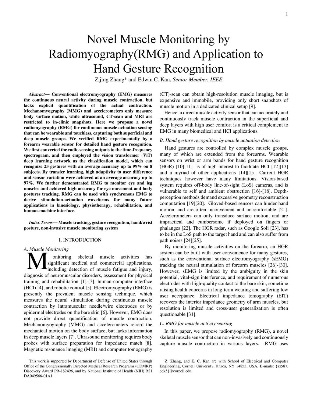 Novel Muscle Monitoring by Radiomyography(RMG) and Application to Hand