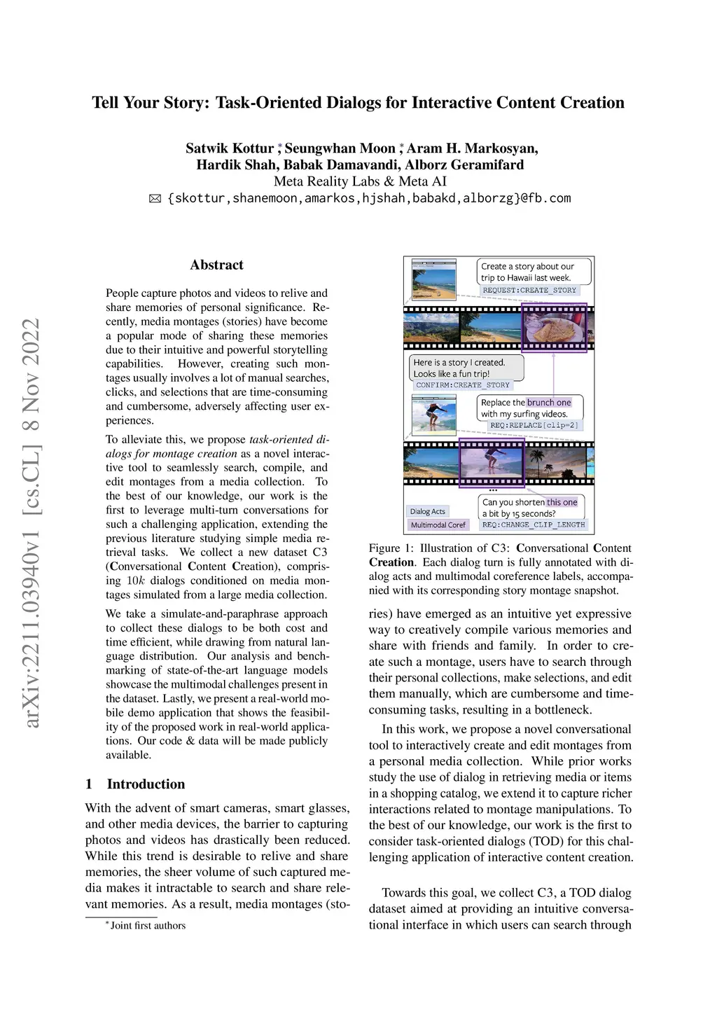 People capture photos and videos to relive and share memories of personal significance. Recently, media montages (stories) have become a popular mode of sharing these memories due to their intuitive and powerful storytelling capabilities. However, creating such montages usually involves a lot of manual searches, clicks, and selections that are time-consuming and cumbersome, adversely affecting user experiences. To alleviate this, we propose task-oriented dialogs for montage creation as a novel interactive tool to seamlessly search, compile, and edit montages from a media collection. To the best of our knowledge, our work is the first to leverage multi-turn conversations for such a challenging application, extending the previous literature studying simple media retrieval tasks. We collect a new dataset C3 (Conversational Content Creation), comprising 10k dialogs conditioned on media montages simulated from a large media collection. We take a simulate-and-paraphrase approach to collect these dialogs to be both cost and time efficient, while drawing from natural language distribution. Our analysis and benchmarking of state-of-the-art language models showcase the multimodal challenges present in the dataset. Lastly, we present a real-world mobile demo application that shows the feasibility of the proposed work in real-world applications. Our code and data will be made publicly available.