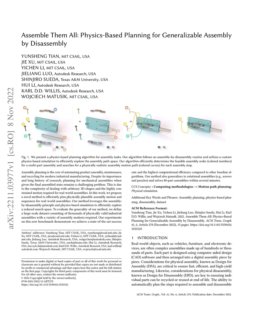 Assembly planning is the core of automating product assembly, maintenance, and recycling for modern industrial manufacturing. Despite its importance and long history of research, planning for mechanical assemblies when given the final assembled state remains a challenging problem. This is due to the complexity of dealing with arbitrary 3D shapes and the highly constrained motion required for real-world assemblies. In this work, we propose a novel method to efficiently plan physically plausible assembly motion and sequences for real-world assemblies. Our method leverages the assembly-by-disassembly principle and physics-based simulation to efficiently explore a reduced search space. To evaluate the generality of our method, we define a large-scale dataset consisting of thousands of physically valid industrial assemblies with a variety of assembly motions required. Our experiments on this new benchmark demonstrate we achieve a state-of-the-art success rate and the highest computational efficiency compared to other baseline algorithms. Our method also generalizes to rotational assemblies (e.g., screws and puzzles) and solves 80-part assemblies within several minutes.