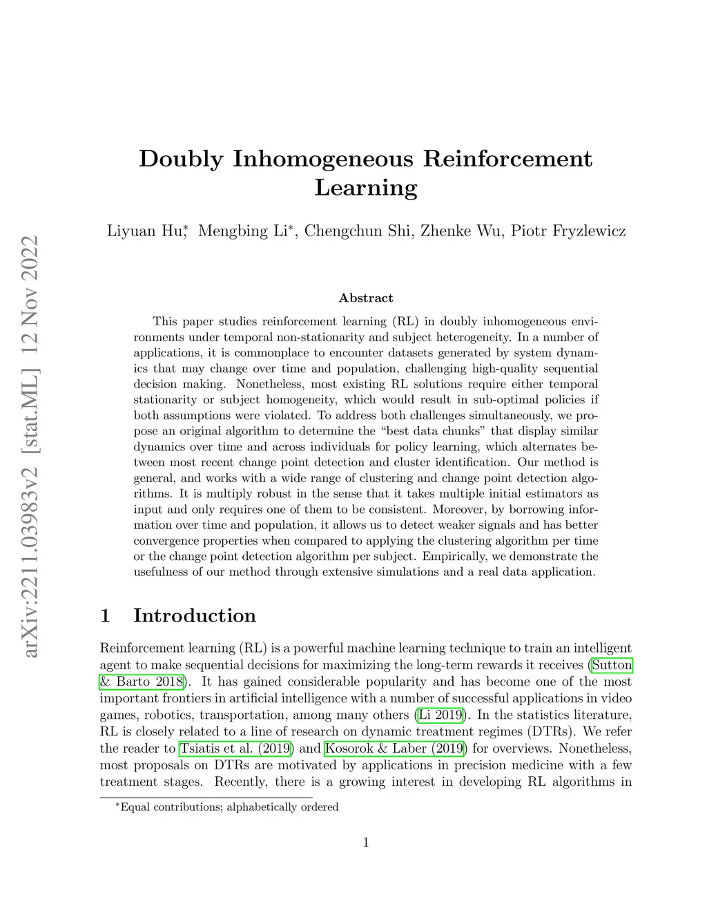 This paper studies reinforcement learning (RL) in doubly inhomogeneous environments under temporal non-stationarity and subject heterogeneity. In a number of applications, it is commonplace to encounter datasets generated by system dynamics that may change over time and population, challenging high-quality sequential decision making. Nonetheless, most existing RL solutions require either temporal stationarity or subject homogeneity, which would result in sub-optimal policies if both assumptions were violated. To address both challenges simultaneously, we propose an original algorithm to determine the ``best data chunks" that display similar dynamics over time and across individuals for policy learning, which alternates between most recent change point detection and cluster identification. Our method is general, and works with a wide range of clustering and change point detection algorithms. It is multiply robust in the sense that it takes multiple initial estimators as input and only requires one of them to be consistent. Moreover, by borrowing information over time and population, it allows us to detect weaker signals and has better convergence properties when compared to applying the clustering algorithm per time or the change point detection algorithm per subject. Empirically, we demonstrate the usefulness of our method through extensive simulations and a real data application.