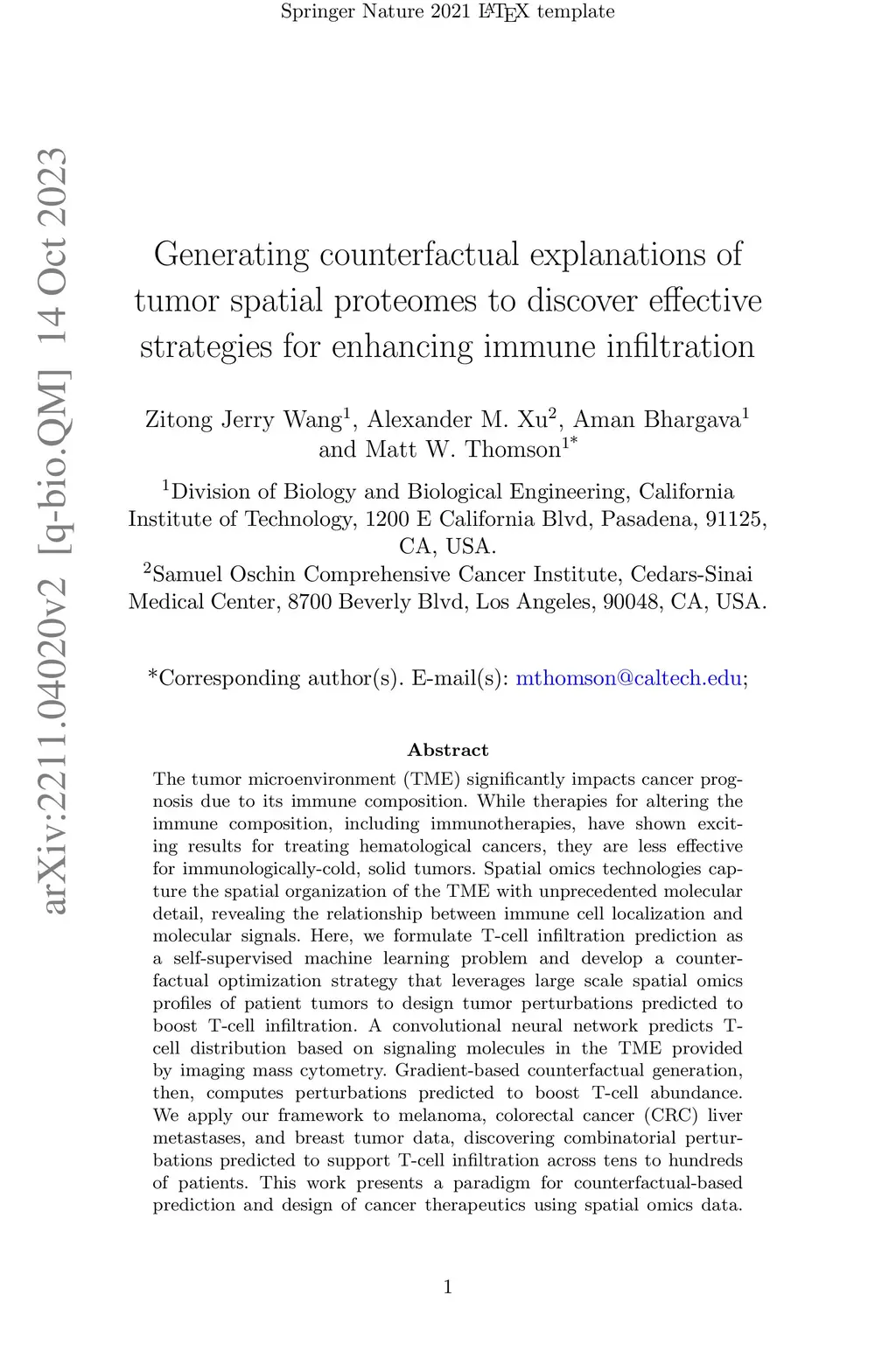 The tumor microenvironment (TME) significantly impacts cancer prognosis due to its immune composition. While therapies for altering the immune composition, including immunotherapies, have shown exciting results for treating hematological cancers, they are less effective for immunologically-cold, solid tumors. Spatial omics technologies capture the spatial organization of the TME with unprecedented molecular detail, revealing the relationship between immune cell localization and molecular signals. Here, we formulate T-cell infiltration prediction as a self-supervised machine learning problem and develop a counterfactual optimization strategy that leverages large scale spatial omics profiles of patient tumors to design tumor perturbations predicted to boost T-cell infiltration. A convolutional neural network predicts T-cell distribution based on signaling molecules in the TME provided by imaging mass cytometry. Gradient-based counterfactual generation, then, computes perturbations predicted to boost T-cell abundance. We apply our framework to melanoma, colorectal cancer liver metastases, and breast tumor data, discovering combinatorial perturbations predicted to support T-cell infiltration across tens to hundreds of patients. This work presents a paradigm for counterfactual-based prediction and design of cancer therapeutics using spatial omics data.