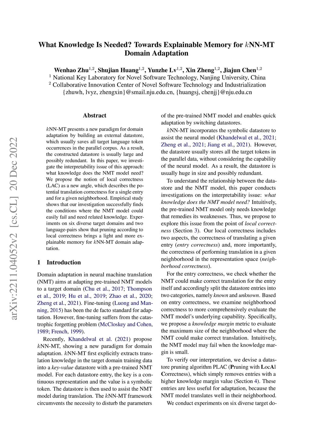 kNN-MT presents a new paradigm for domain adaptation by building an external datastore, which usually saves all target language token occurrences in the parallel corpus. As a result, the constructed datastore is usually large and possibly redundant. In this paper, we investigate the interpretability issue of this approach: what knowledge does the NMT model need? We propose the notion of local correctness (LAC) as a new angle, which describes the potential translation correctness for a single entry and for a given neighborhood. Empirical study shows that our investigation successfully finds the conditions where the NMT model could easily fail and need related knowledge. Experiments on six diverse target domains and two language-pairs show that pruning according to local correctness brings a light and more explainable memory for kNN-MT domain adaptation.