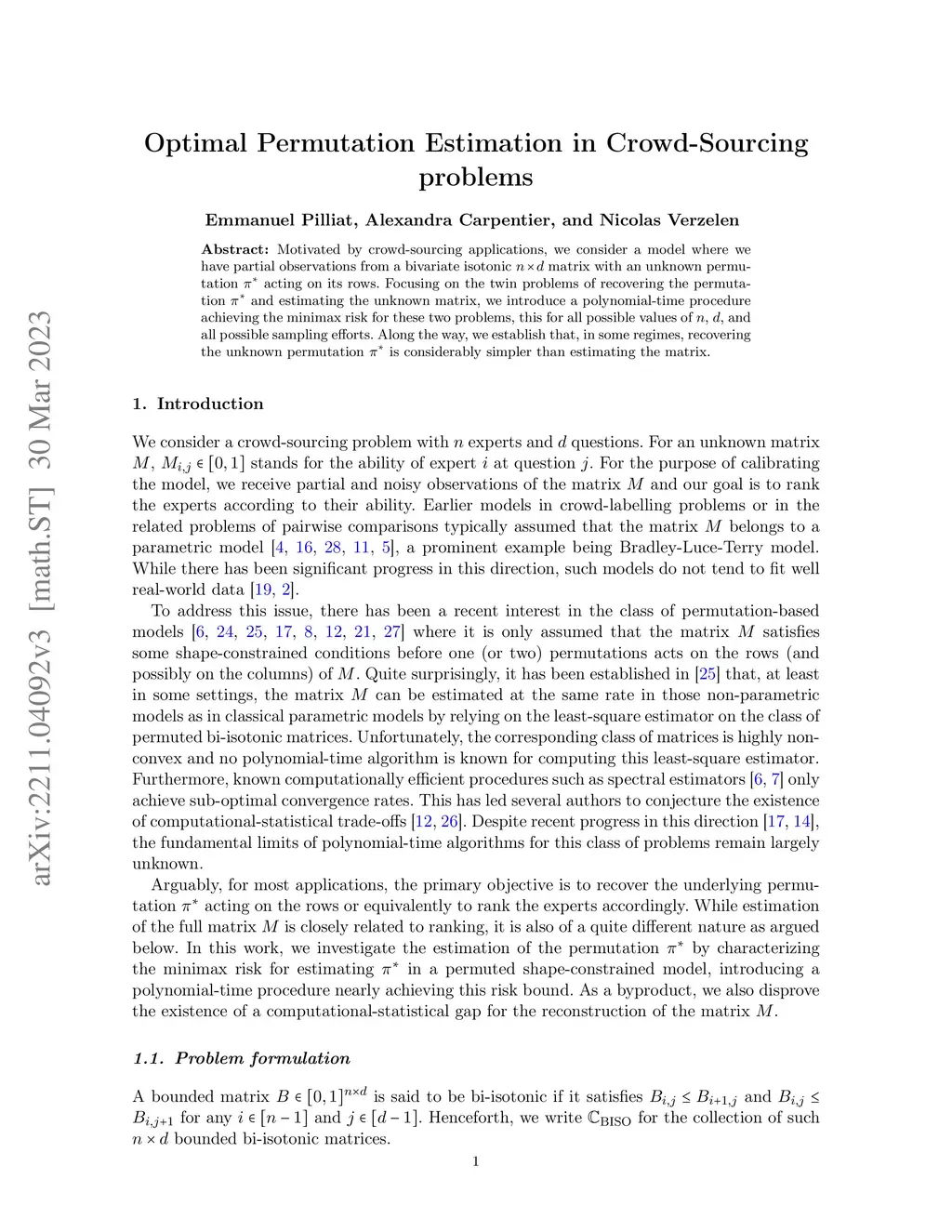 Motivated by crowd-sourcing applications, we consider a model where we have partial observations from a bivariate isotonic n x d matrix with an unknown permutation * acting on its rows. Focusing on the twin problems of recovering the permutation * and estimating the unknown matrix, we introduce a polynomial-time procedure achieving the minimax risk for these two problems, this for all possible values of n, d, and all possible sampling efforts. Along the way, we establish that, in some regimes, recovering the unknown permutation * is considerably simpler than estimating the matrix.