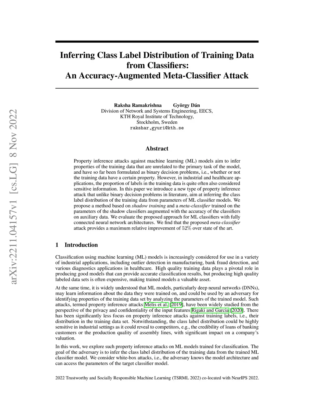 Property inference attacks against machine learning (ML) models aim to infer properties of the training data that are unrelated to the primary task of the model, and have so far been formulated as binary decision problems, i.e., whether or not the training data have a certain property. However, in industrial and healthcare applications, the proportion of labels in the training data is quite often also considered sensitive information. In this paper we introduce a new type of property inference attack that unlike binary decision problems in literature, aim at inferring the class label distribution of the training data from parameters of ML classifier models. We propose a method based on \emph{shadow training} and a \emph{meta-classifier} trained on the parameters of the shadow classifiers augmented with the accuracy of the classifiers on auxiliary data. We evaluate the proposed approach for ML classifiers with fully connected neural network architectures. We find that the proposed \emph{meta-classifier} attack provides a maximum relative improvement of over state of the art.