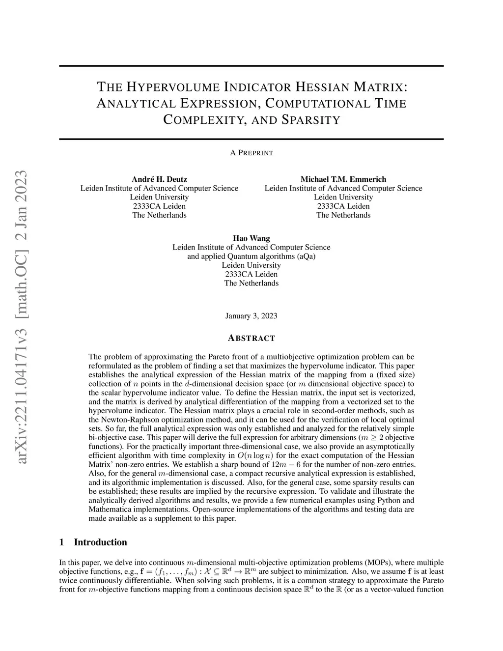 The problem of approximating the Pareto front of a multiobjective optimization problem can be reformulated as the problem of finding a set that maximizes the hypervolume indicator. This paper establishes the analytical expression of the Hessian matrix of the mapping from a (fixed size) collection of points in the -dimensional decision space (or dimensional objective space) to the scalar hypervolume indicator value. To define the Hessian matrix, the input set is vectorized, and the matrix is derived by analytical differentiation of the mapping from a vectorized set to the hypervolume indicator. The Hessian matrix plays a crucial role in second-order methods, such as the Newton-Raphson optimization method, and it can be used for the verification of local optimal sets. So far, the full analytical expression was only established and analyzed for the relatively simple bi-objective case. This paper will derive the full expression for arbitrary dimensions ( objective functions). For the practically important three-dimensional case, we also provide an asymptotically efficient algorithm with time complexity in for the exact computation of the Hessian Matrix' non-zero entries. We establish a sharp bound of for the number of non-zero entries. Also, for the general -dimensional case, a compact recursive analytical expression is established, and its algorithmic implementation is discussed. Also, for the general case, some sparsity results can be established; these results are implied by the recursive expression. To validate and illustrate the analytically derived algorithms and results, we provide a few numerical examples using Python and Mathematica implementations. Open-source implementations of the algorithms and testing data are made available as a supplement to this paper.