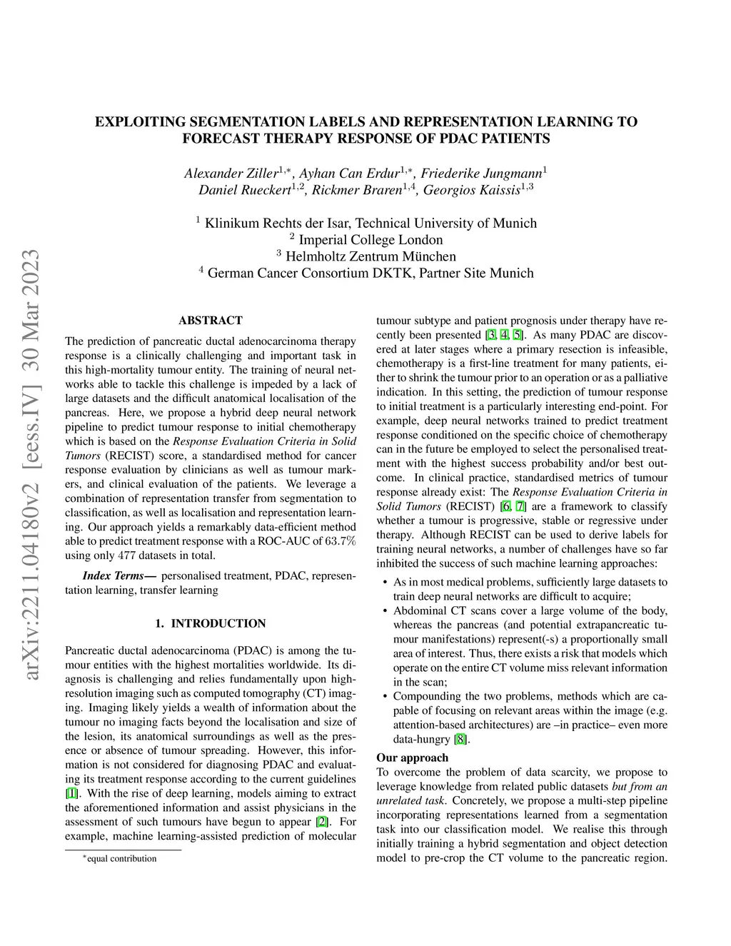 The prediction of pancreatic ductal adenocarcinoma therapy response is a clinically challenging and important task in this high-mortality tumour entity. The training of neural networks able to tackle this challenge is impeded by a lack of large datasets and the difficult anatomical localisation of the pancreas. Here, we propose a hybrid deep neural network pipeline to predict tumour response to initial chemotherapy which is based on the Response Evaluation Criteria in Solid Tumors (RECIST) score, a standardised method for cancer response evaluation by clinicians as well as tumour markers, and clinical evaluation of the patients. We leverage a combination of representation transfer from segmentation to classification, as well as localisation and representation learning. Our approach yields a remarkably data-efficient method able to predict treatment response with a ROC-AUC of 63.7% using only 477 datasets in total.