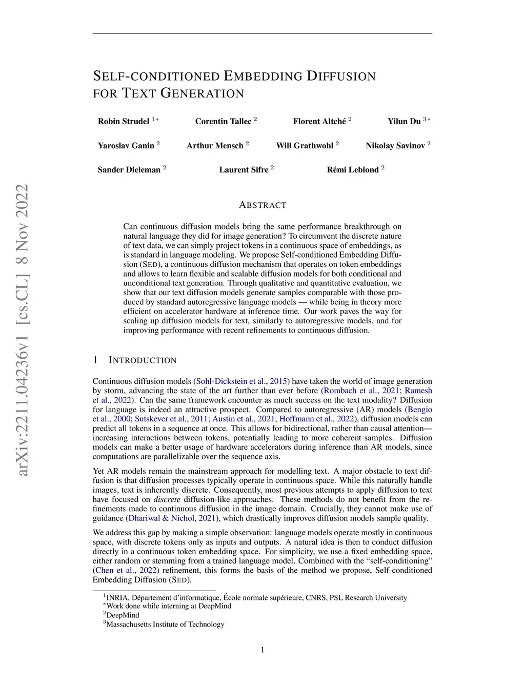 Self-conditioned Embedding Diffusion for Text Generation