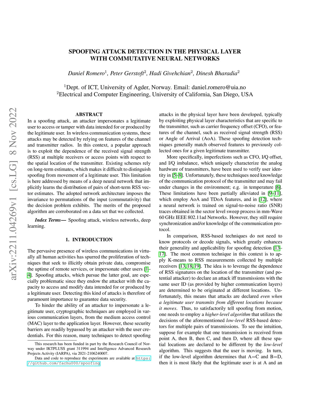 In a spoofing attack, an attacker impersonates a legitimate user to access or tamper with data intended for or produced by the legitimate user. In wireless communication systems, these attacks may be detected by relying on features of the channel and transmitter radios. In this context, a popular approach is to exploit the dependence of the received signal strength (RSS) at multiple receivers or access points with respect to the spatial location of the transmitter. Existing schemes rely on long-term estimates, which makes it difficult to distinguish spoofing from movement of a legitimate user. This limitation is here addressed by means of a deep neural network that implicitly learns the distribution of pairs of short-term RSS vector estimates. The adopted network architecture imposes the invariance to permutations of the input (commutativity) that the decision problem exhibits. The merits of the proposed algorithm are corroborated on a data set that we collected.