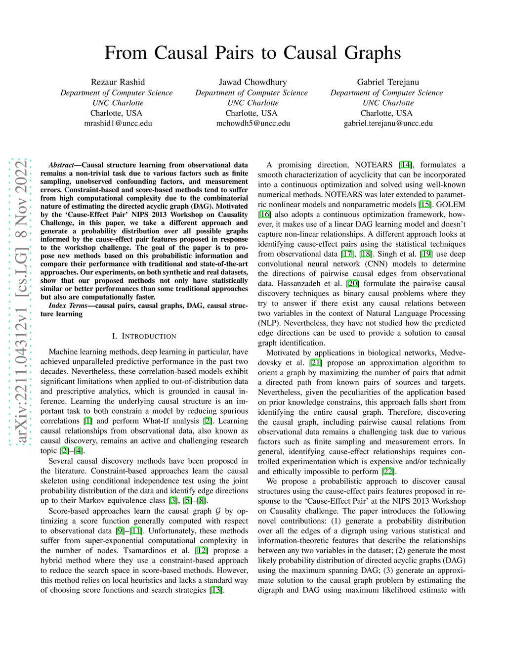 Causal structure learning from observational data remains a non-trivial task due to various factors such as finite sampling, unobserved confounding factors, and measurement errors. Constraint-based and score-based methods tend to suffer from high computational complexity due to the combinatorial nature of estimating the directed acyclic graph (DAG). Motivated by the `Cause-Effect Pair' NIPS 2013 Workshop on Causality Challenge, in this paper, we take a different approach and generate a probability distribution over all possible graphs informed by the cause-effect pair features proposed in response to the workshop challenge. The goal of the paper is to propose new methods based on this probabilistic information and compare their performance with traditional and state-of-the-art approaches. Our experiments, on both synthetic and real datasets, show that our proposed methods not only have statistically similar or better performances than some traditional approaches but also are computationally faster.