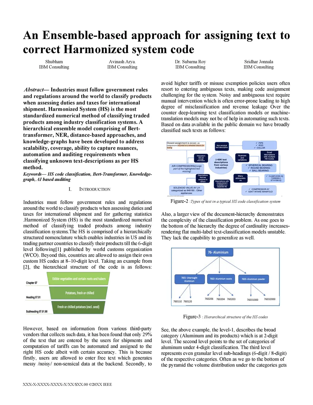 Industries must follow government rules and regulations around the world to classify products when assessing duties and taxes for international shipment. Harmonized System (HS) is the most standardized numerical method of classifying traded products among industry classification systems. A hierarchical ensemble model comprising of Bert-transformer, NER, distance-based approaches, and knowledge-graphs have been developed to address scalability, coverage, ability to capture nuances, automation and auditing requirements when classifying unknown text-descriptions as per HS method.