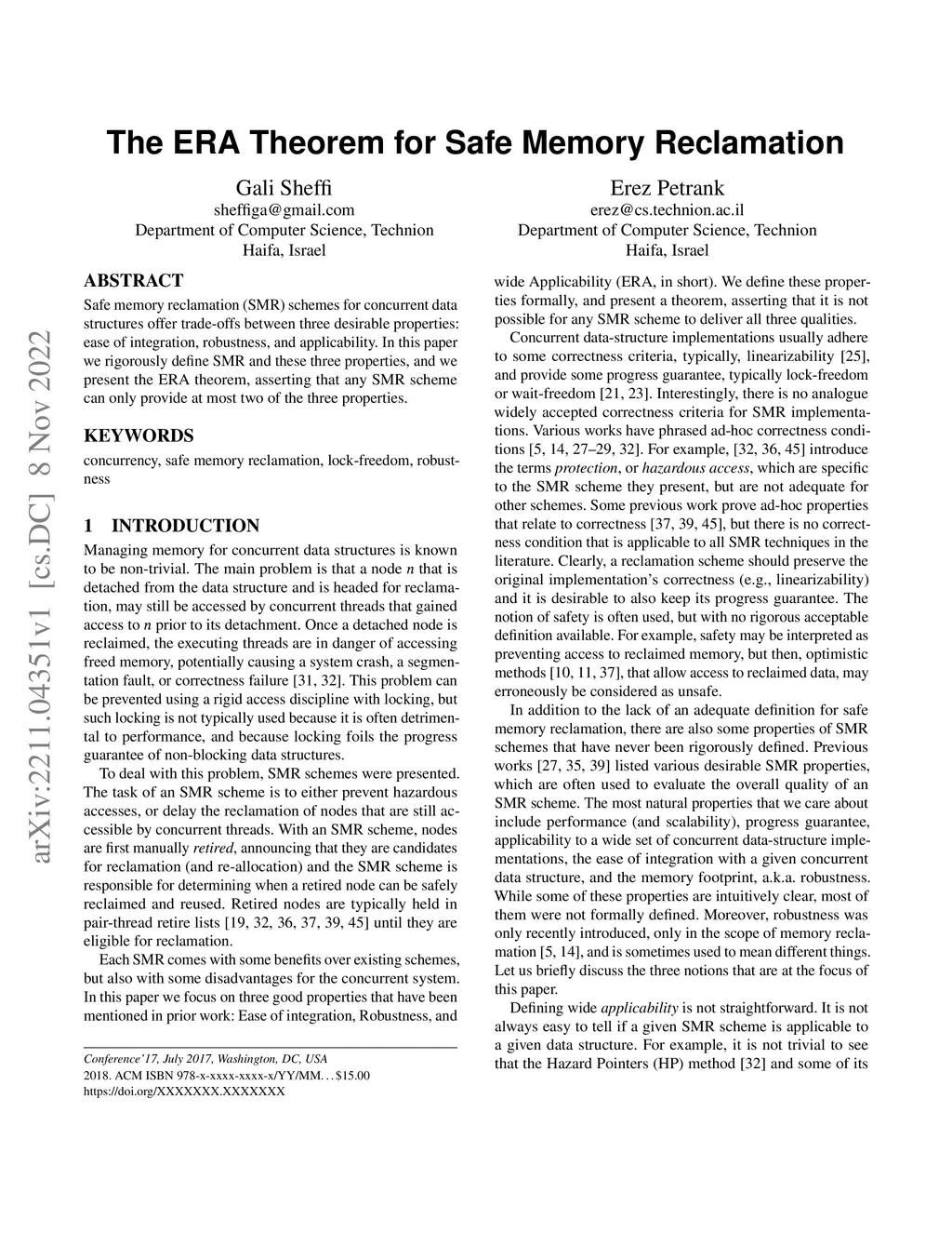 Safe memory reclamation (SMR) schemes for concurrent data structures offer trade-offs between three desirable properties: ease of integration, robustness, and applicability. In this paper we rigorously define SMR and these three properties, and we present the ERA theorem, asserting that any SMR scheme can only provide at most two of the three properties.