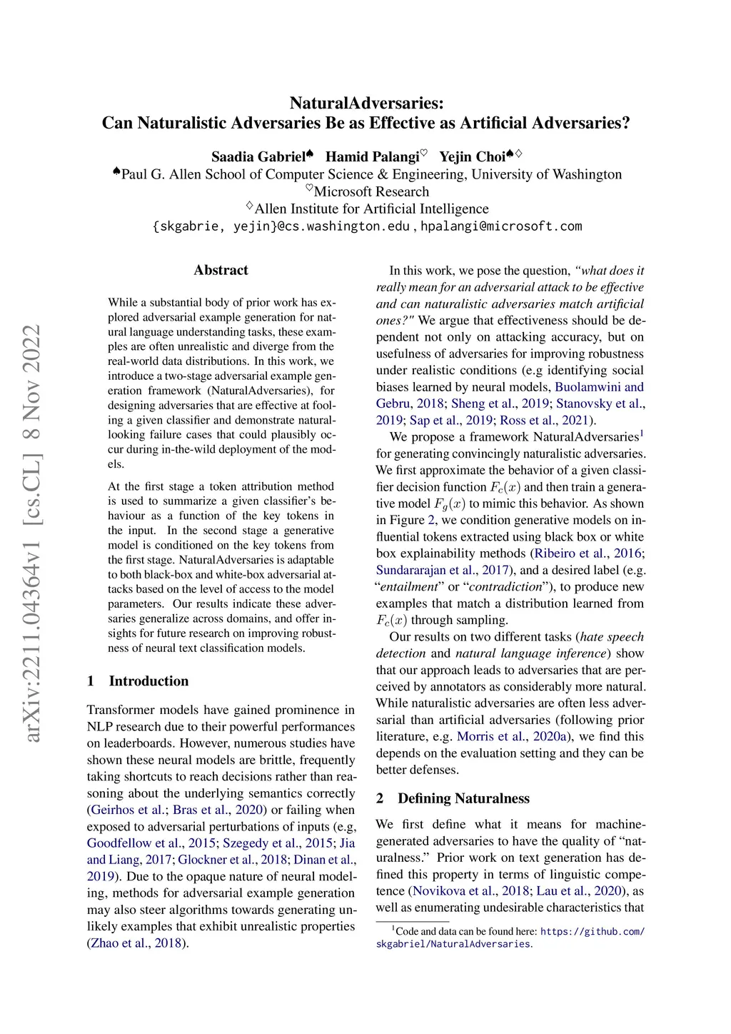 While a substantial body of prior work has explored adversarial example generation for natural language understanding tasks, these examples are often unrealistic and diverge from the real-world data distributions. In this work, we introduce a two-stage adversarial example generation framework (NaturalAdversaries), for designing adversaries that are effective at fooling a given classifier and demonstrate natural-looking failure cases that could plausibly occur during in-the-wild deployment of the models. At the first stage a token attribution method is used to summarize a given classifier's behaviour as a function of the key tokens in the input. In the second stage a generative model is conditioned on the key tokens from the first stage. NaturalAdversaries is adaptable to both black-box and white-box adversarial attacks based on the level of access to the model parameters. Our results indicate these adversaries generalize across domains, and offer insights for future research on improving robustness of neural text classification models.