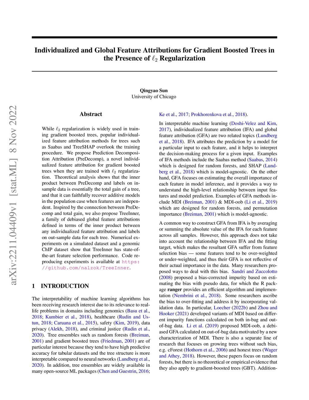 While regularization is widely used in training gradient boosted trees, popular individualized feature attribution methods for trees such as Saabas and TreeSHAP overlook the training procedure. We propose Prediction Decomposition Attribution (PreDecomp), a novel individualized feature attribution for gradient boosted trees when they are trained with regularization. Theoretical analysis shows that the inner product between PreDecomp and labels on in-sample data is essentially the total gain of a tree, and that it can faithfully recover additive models in the population case when features are independent. Inspired by the connection between PreDecomp and total gain, we also propose TreeInner, a family of debiased global feature attributions defined in terms of the inner product between any individualized feature attribution and labels on out-sample data for each tree. Numerical experiments on a simulated dataset and a genomic ChIP dataset show that TreeInner has state-of-the-art feature selection performance. Code reproducing experiments is available at https://github.com/nalzok/TreeInner .