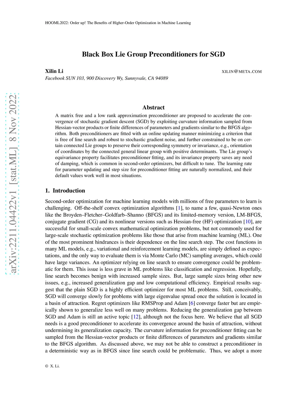 A matrix free and a low rank approximation preconditioner are proposed to accelerate the convergence of stochastic gradient descent (SGD) by exploiting curvature information sampled from Hessian-vector products or finite differences of parameters and gradients similar to the BFGS algorithm. Both preconditioners are fitted with an online updating manner minimizing a criterion that is free of line search and robust to stochastic gradient noise, and further constrained to be on certain connected Lie groups to preserve their corresponding symmetry or invariance, e.g., orientation of coordinates by the connected general linear group with positive determinants. The Lie group's equivariance property facilitates preconditioner fitting, and its invariance property saves any need of damping, which is common in second-order optimizers, but difficult to tune. The learning rate for parameter updating and step size for preconditioner fitting are naturally normalized, and their default values work well in most situations.