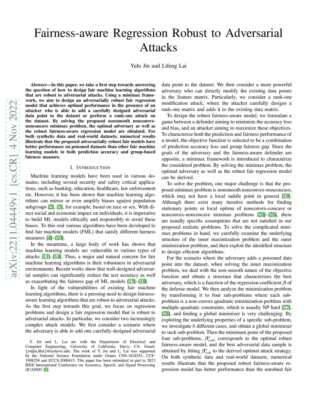 In this paper, we take a first step towards answering the question of how to design fair machine learning algorithms that are robust to adversarial attacks. Using a minimax framework, we aim to design an adversarially robust fair regression model that achieves optimal performance in the presence of an attacker who is able to add a carefully designed adversarial data point to the dataset or perform a rank-one attack on the dataset. By solving the proposed nonsmooth nonconvex-nonconcave minimax problem, the optimal adversary as well as the robust fairness-aware regression model are obtained. For both synthetic data and real-world datasets, numerical results illustrate that the proposed adversarially robust fair models have better performance on poisoned datasets than other fair machine learning models in both prediction accuracy and group-based fairness measure.