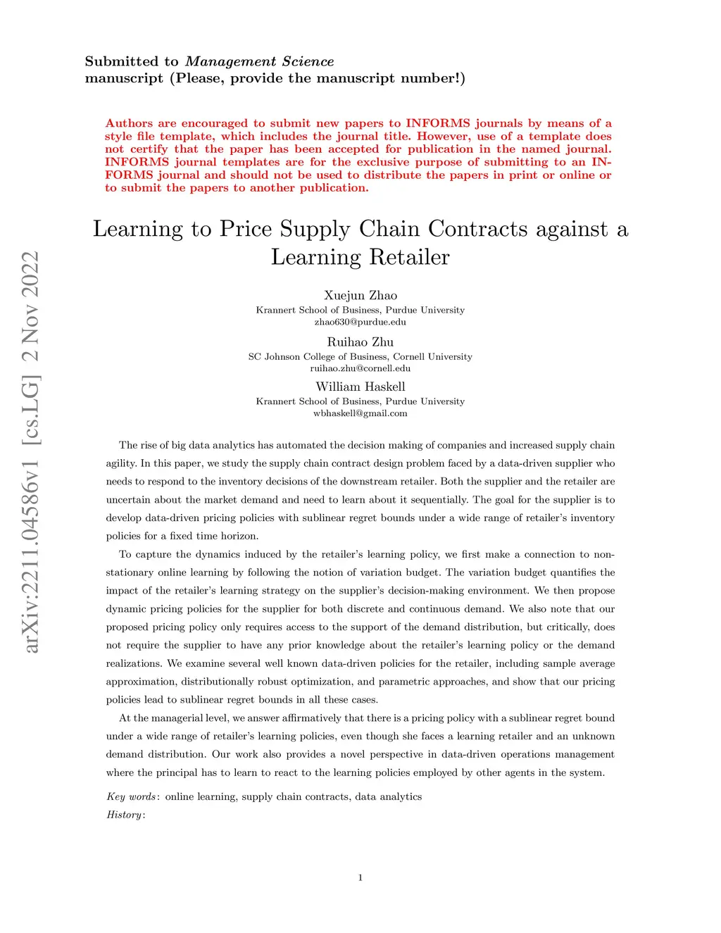The rise of big data analytics has automated the decision-making of companies and increased supply chain agility. In this paper, we study the supply chain contract design problem faced by a data-driven supplier who needs to respond to the inventory decisions of the downstream retailer. Both the supplier and the retailer are uncertain about the market demand and need to learn about it sequentially. The goal for the supplier is to develop data-driven pricing policies with sublinear regret bounds under a wide range of possible retailer inventory policies for a fixed time horizon. To capture the dynamics induced by the retailer's learning policy, we first make a connection to non-stationary online learning by following the notion of variation budget. The variation budget quantifies the impact of the retailer's learning strategy on the supplier's decision-making. We then propose dynamic pricing policies for the supplier for both discrete and continuous demand. We also note that our proposed pricing policy only requires access to the support of the demand distribution, but critically, does not require the supplier to have any prior knowledge about the retailer's learning policy or the demand realizations. We examine several well-known data-driven policies for the retailer, including sample average approximation, distributionally robust optimization, and parametric approaches, and show that our pricing policies lead to sublinear regret bounds in all these cases. At the managerial level, we answer affirmatively that there is a pricing policy with a sublinear regret bound under a wide range of retailer's learning policies, even though she faces a learning retailer and an unknown demand distribution. Our work also provides a novel perspective in data-driven operations management where the principal has to learn to react to the learning policies employed by other agents in the system.