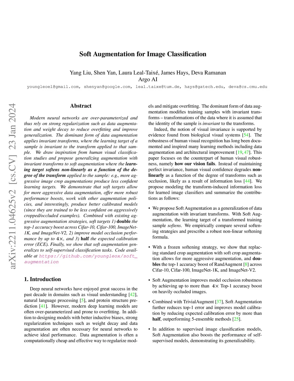 Modern neural networks are over-parameterized and thus rely on strong regularization such as data augmentation and weight decay to reduce overfitting and improve generalization. The dominant form of data augmentation applies invariant transforms, where the learning target of a sample is invariant to the transform applied to that sample. We draw inspiration from human visual classification studies and propose generalizing augmentation with invariant transforms to soft augmentation where the learning target softens non-linearly as a function of the degree of the transform applied to the sample: e.g., more aggressive image crop augmentations produce less confident learning targets. We demonstrate that soft targets allow for more aggressive data augmentation, offer more robust performance boosts, work with other augmentation policies, and interestingly, produce better calibrated models (since they are trained to be less confident on aggressively cropped/occluded examples). Combined with existing aggressive augmentation strategies, soft target 1) doubles the top-1 accuracy boost across Cifar-10, Cifar-100, ImageNet-1K, and ImageNet-V2, 2) improves model occlusion performance by up to , and 3) halves the expected calibration error (ECE). Finally, we show that soft augmentation generalizes to self-supervised classification tasks. Code available at https://github.com/youngleox/soft_augmentation