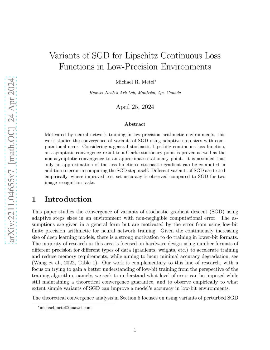 Motivated by neural network training in low-precision arithmetic environments, this work studies the convergence of variants of SGD using adaptive step sizes with computational error. Considering a general stochastic Lipschitz continuous loss function, an asymptotic convergence result to a Clarke stationary point is proven as well as the non-asymptotic convergence to an approximate stationary point. It is assumed that only an approximation of the loss function's stochastic gradient can be computed in addition to error in computing the SGD step itself. Different variants of SGD are tested empirically, where improved test set accuracy is observed compared to SGD for two image recognition tasks.