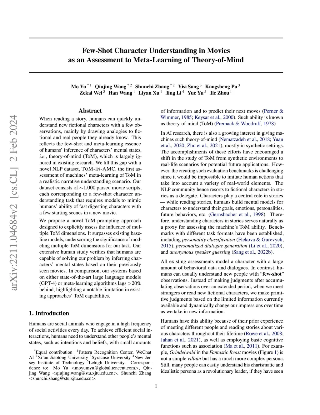 When reading a story, humans can quickly understand new fictional characters with a few observations, mainly by drawing analogies to fictional and real people they already know. This reflects the few-shot and meta-learning essence of humans' inference of characters' mental states, i.e., theory-of-mind (ToM), which is largely ignored in existing research. We fill this gap with a novel NLP dataset, ToM-in-AMC, the first assessment of machines' meta-learning of ToM in a realistic narrative understanding scenario. Our dataset consists of ~1,000 parsed movie scripts, each corresponding to a few-shot character understanding task that requires models to mimic humans' ability of fast digesting characters with a few starting scenes in a new movie. We propose a novel ToM prompting approach designed to explicitly assess the influence of multiple ToM dimensions. It surpasses existing baseline models, underscoring the significance of modeling multiple ToM dimensions for our task. Our extensive human study verifies that humans are capable of solving our problem by inferring characters' mental states based on their previously seen movies. In comparison, our systems based on either state-of-the-art large language models (GPT-4) or meta-learning algorithms lags >20% behind, highlighting a notable limitation in existing approaches' ToM capabilities.