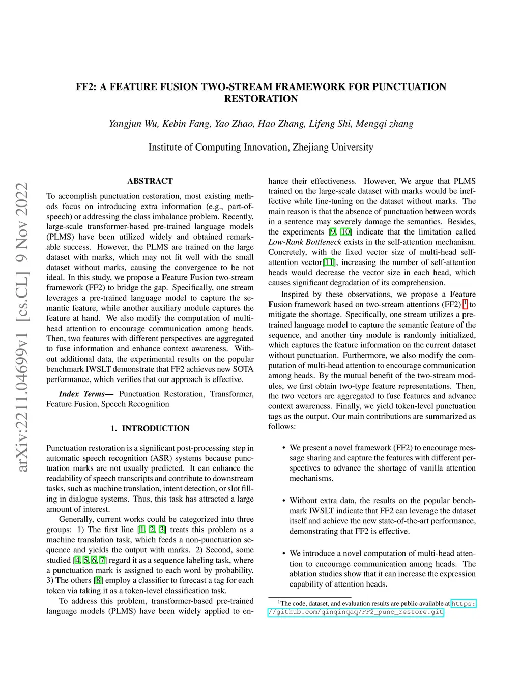 FF2: A Feature Fusion Two-Stream Framework for Punctuation Restoration