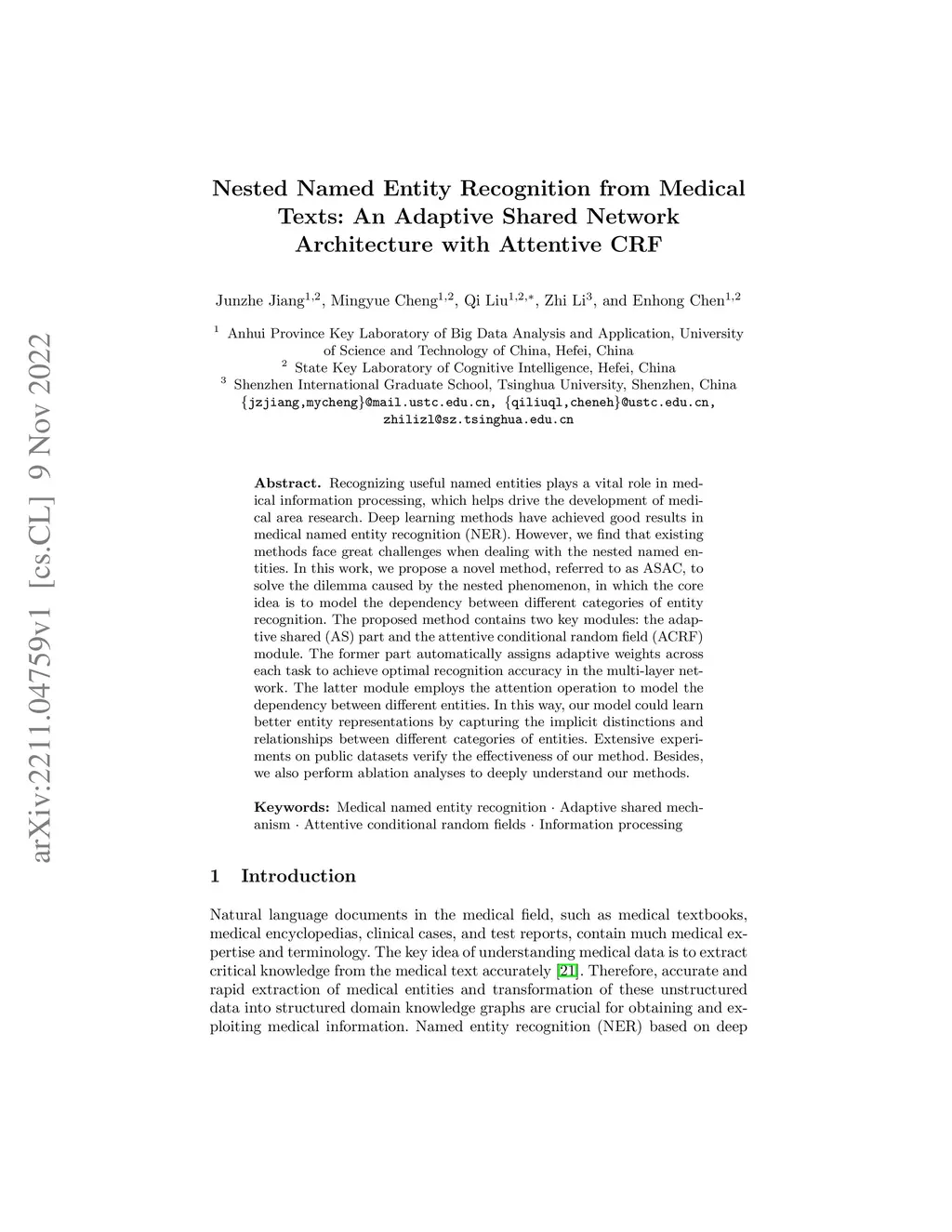 Recognizing useful named entities plays a vital role in medical information processing, which helps drive the development of medical area research. Deep learning methods have achieved good results in medical named entity recognition (NER). However, we find that existing methods face great challenges when dealing with the nested named entities. In this work, we propose a novel method, referred to as ASAC, to solve the dilemma caused by the nested phenomenon, in which the core idea is to model the dependency between different categories of entity recognition. The proposed method contains two key modules: the adaptive shared (AS) part and the attentive conditional random field (ACRF) module. The former part automatically assigns adaptive weights across each task to achieve optimal recognition accuracy in the multi-layer network. The latter module employs the attention operation to model the dependency between different entities. In this way, our model could learn better entity representations by capturing the implicit distinctions and relationships between different categories of entities. Extensive experiments on public datasets verify the effectiveness of our method. Besides, we also perform ablation analyses to deeply understand our methods.