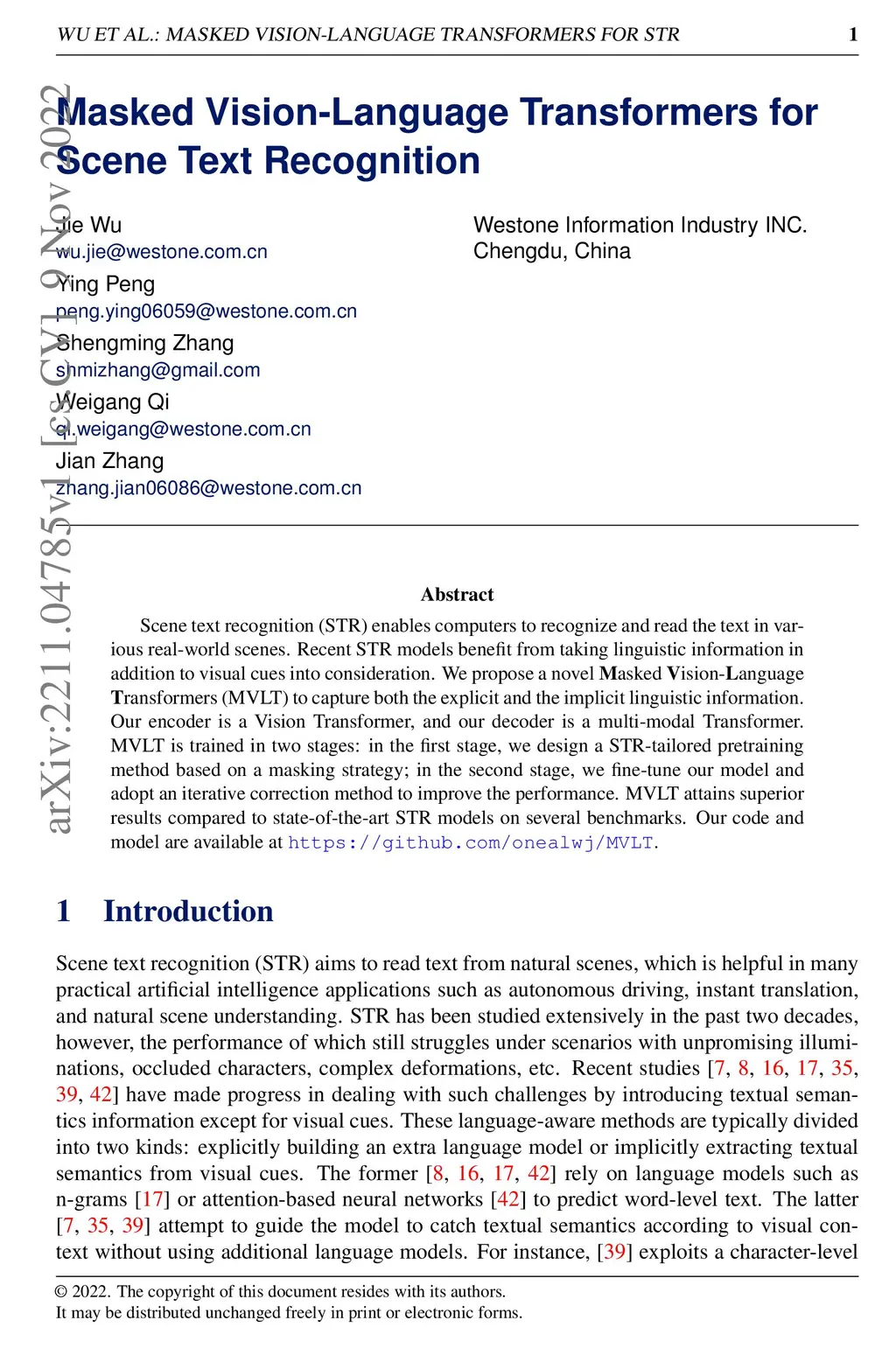 Scene text recognition (STR) enables computers to recognize and read the text in various real-world scenes. Recent STR models benefit from taking linguistic information in addition to visual cues into consideration. We propose a novel Masked Vision-Language Transformers (MVLT) to capture both the explicit and the implicit linguistic information. Our encoder is a Vision Transformer, and our decoder is a multi-modal Transformer. MVLT is trained in two stages: in the first stage, we design a STR-tailored pretraining method based on a masking strategy; in the second stage, we fine-tune our model and adopt an iterative correction method to improve the performance. MVLT attains superior results compared to state-of-the-art STR models on several benchmarks. Our code and model are available at https://github.com/onealwj/MVLT.