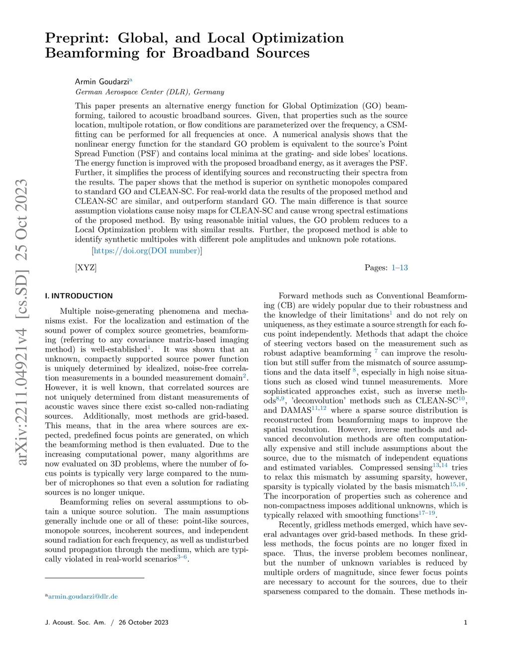 This paper presents an alternative energy function for Global Optimization (GO) beamforming, tailored to acoustic broadband sources. Given, that properties such as the source location, multipole rotation, or flow conditions are parameterized over the frequency, a CSM-fitting can be performed for all frequencies at once. A numerical analysis shows that the nonlinear energy function for the standard GO problem is equivalent to the source's Point Spread Function (PSF) and contains local minima at the grating- and side lobes' locations. The energy function is improved with the proposed broadband energy, as it averages the PSF. Further, it simplifies the process of identifying sources and reconstructing their spectra from the results. The paper shows that the method is superior on synthetic monopoles compared to standard GO and CLEAN-SC. For real-world data the results of the proposed method and CLEAN-SC are similar, and outperform standard GO. The main difference is that source assumption violations cause noisy maps for CLEAN-SC and cause wrong spectral estimations of the proposed method. By using reasonable initial values, the GO problem reduces to a Local Optimization problem with similar results. Further, the proposed method is able to identify synthetic multipoles with different pole amplitudes and unknown pole rotations.