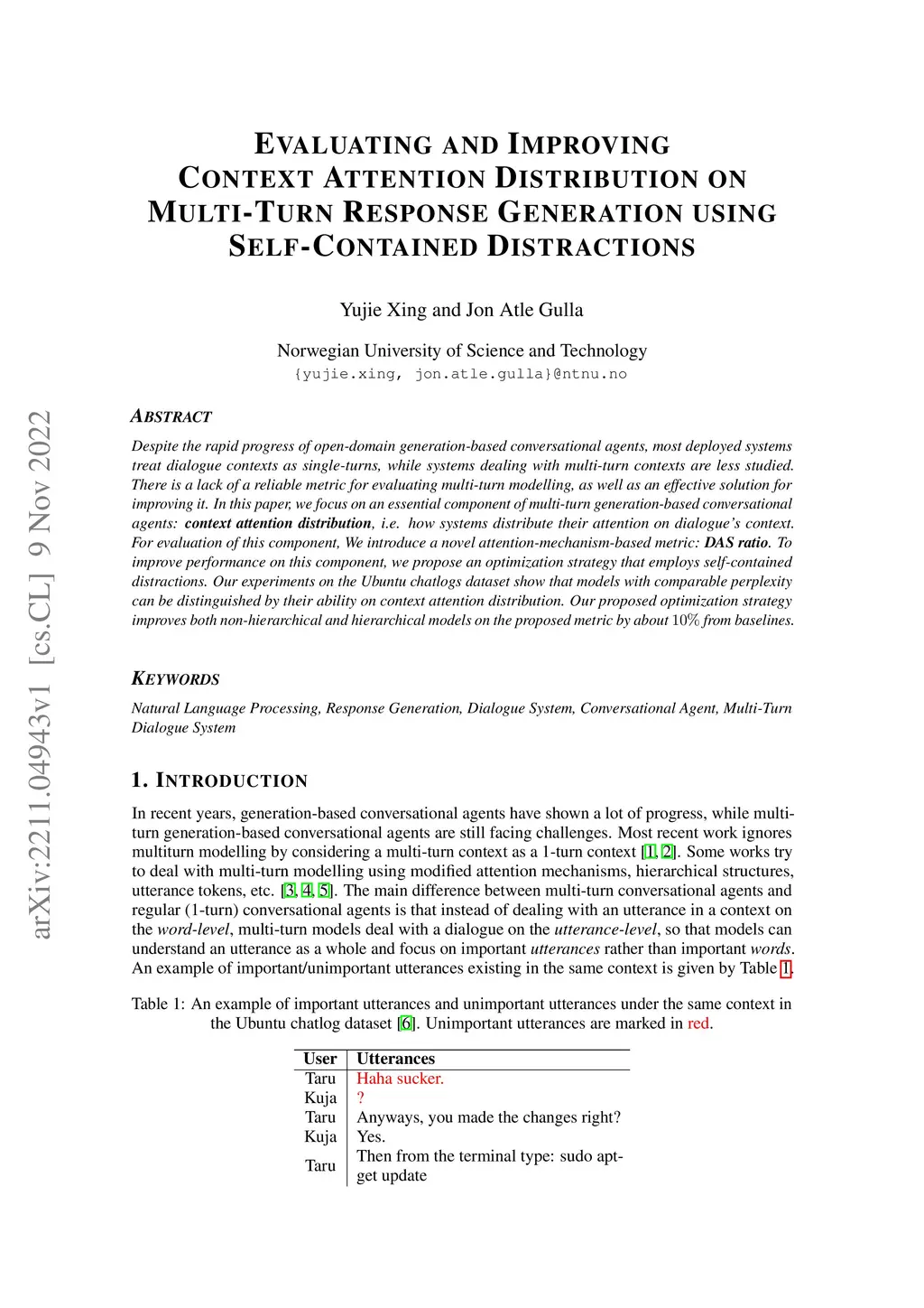 Despite the rapid progress of open-domain generation-based conversational agents, most deployed systems treat dialogue contexts as single-turns, while systems dealing with multi-turn contexts are less studied. There is a lack of a reliable metric for evaluating multi-turn modelling, as well as an effective solution for improving it. In this paper, we focus on an essential component of multi-turn generation-based conversational agents: context attention distribution, i.e. how systems distribute their attention on dialogue's context. For evaluation of this component, We introduce a novel attention-mechanism-based metric: DAS ratio. To improve performance on this component, we propose an optimization strategy that employs self-contained distractions. Our experiments on the Ubuntu chatlogs dataset show that models with comparable perplexity can be distinguished by their ability on context attention distribution. Our proposed optimization strategy improves both non-hierarchical and hierarchical models on the proposed metric by about 10% from baselines.
