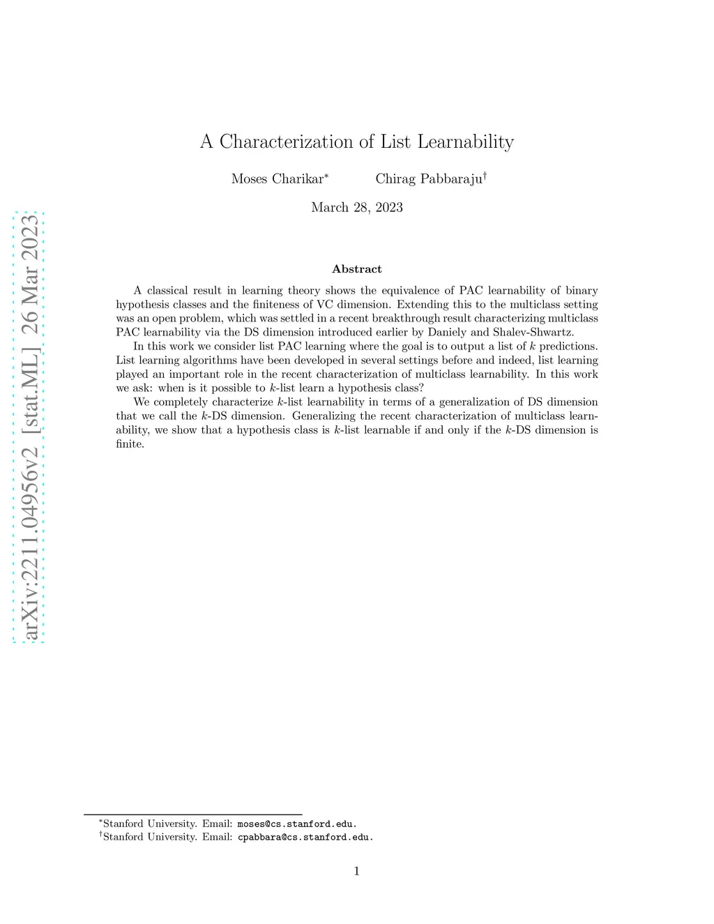 A classical result in learning theory shows the equivalence of PAC learnability of binary hypothesis classes and the finiteness of VC dimension. Extending this to the multiclass setting was an open problem, which was settled in a recent breakthrough result characterizing multiclass PAC learnability via the DS dimension introduced earlier by Daniely and Shalev-Shwartz. In this work we consider list PAC learning where the goal is to output a list of predictions. List learning algorithms have been developed in several settings before and indeed, list learning played an important role in the recent characterization of multiclass learnability. In this work we ask: when is it possible to -list learn a hypothesis class? We completely characterize -list learnability in terms of a generalization of DS dimension that we call the -DS dimension. Generalizing the recent characterization of multiclass learnability, we show that a hypothesis class is -list learnable if and only if the -DS dimension is finite.