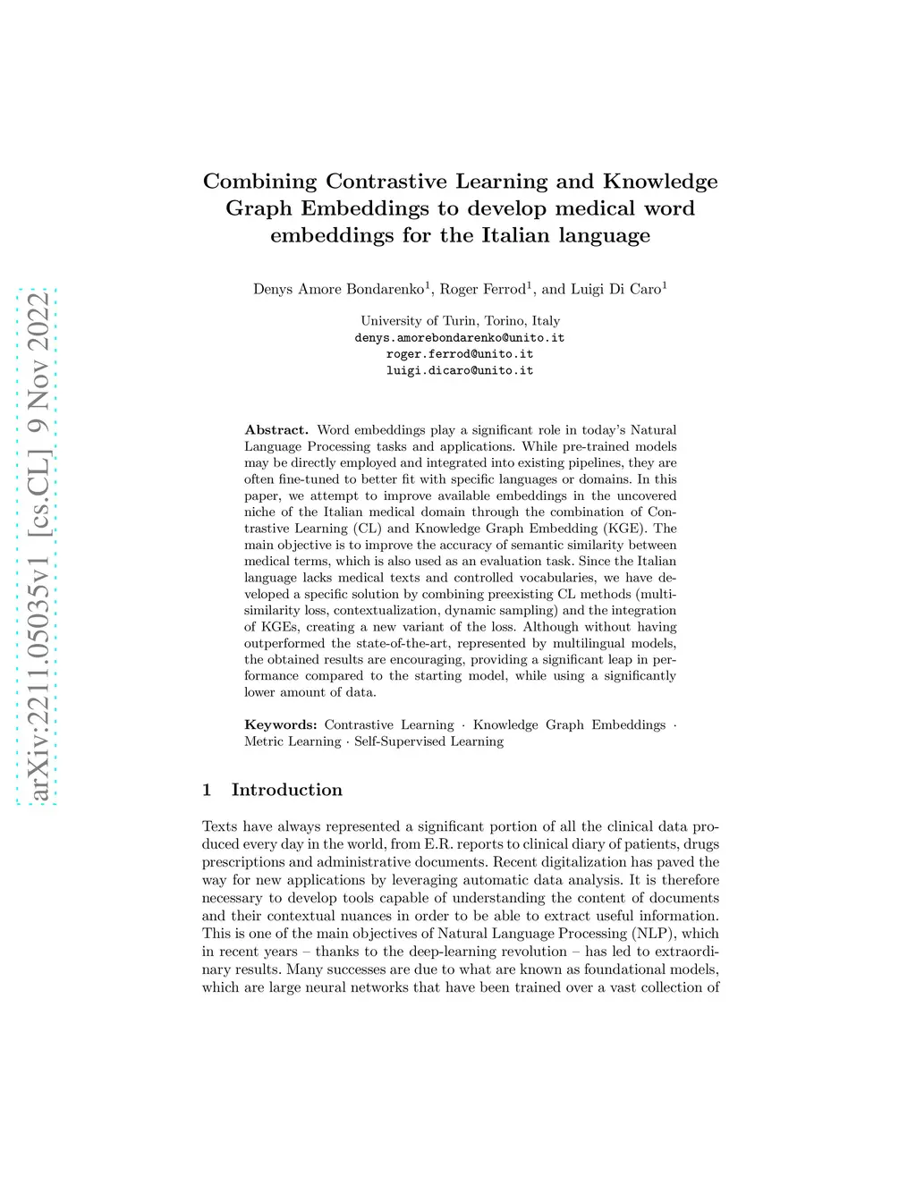 Word embeddings play a significant role in today's Natural Language Processing tasks and applications. While pre-trained models may be directly employed and integrated into existing pipelines, they are often fine-tuned to better fit with specific languages or domains. In this paper, we attempt to improve available embeddings in the uncovered niche of the Italian medical domain through the combination of Contrastive Learning (CL) and Knowledge Graph Embedding (KGE). The main objective is to improve the accuracy of semantic similarity between medical terms, which is also used as an evaluation task. Since the Italian language lacks medical texts and controlled vocabularies, we have developed a specific solution by combining preexisting CL methods (multi-similarity loss, contextualization, dynamic sampling) and the integration of KGEs, creating a new variant of the loss. Although without having outperformed the state-of-the-art, represented by multilingual models, the obtained results are encouraging, providing a significant leap in performance compared to the starting model, while using a significantly lower amount of data.