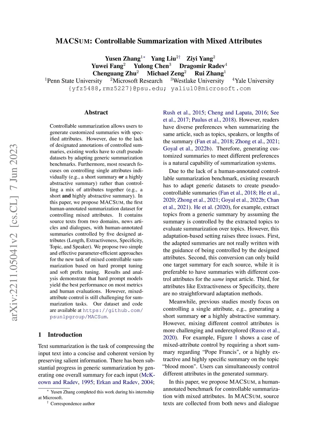 Controllable summarization allows users to generate customized summaries with specified attributes. However, due to the lack of designated annotations of controlled summaries, existing works have to craft pseudo datasets by adapting generic summarization benchmarks. Furthermore, most research focuses on controlling single attributes individually (e.g., a short summary or a highly abstractive summary) rather than controlling a mix of attributes together (e.g., a short and highly abstractive summary). In this paper, we propose MACSum, the first human-annotated summarization dataset for controlling mixed attributes. It contains source texts from two domains, news articles and dialogues, with human-annotated summaries controlled by five designed attributes (Length, Extractiveness, Specificity, Topic, and Speaker). We propose two simple and effective parameter-efficient approaches for the new task of mixed controllable summarization based on hard prompt tuning and soft prefix tuning. Results and analysis demonstrate that hard prompt models yield the best performance on all metrics and human evaluations. However, mixed-attribute control is still challenging for summarization tasks. Our dataset and code are available at https://github.com/psunlpgroup/MACSum.
